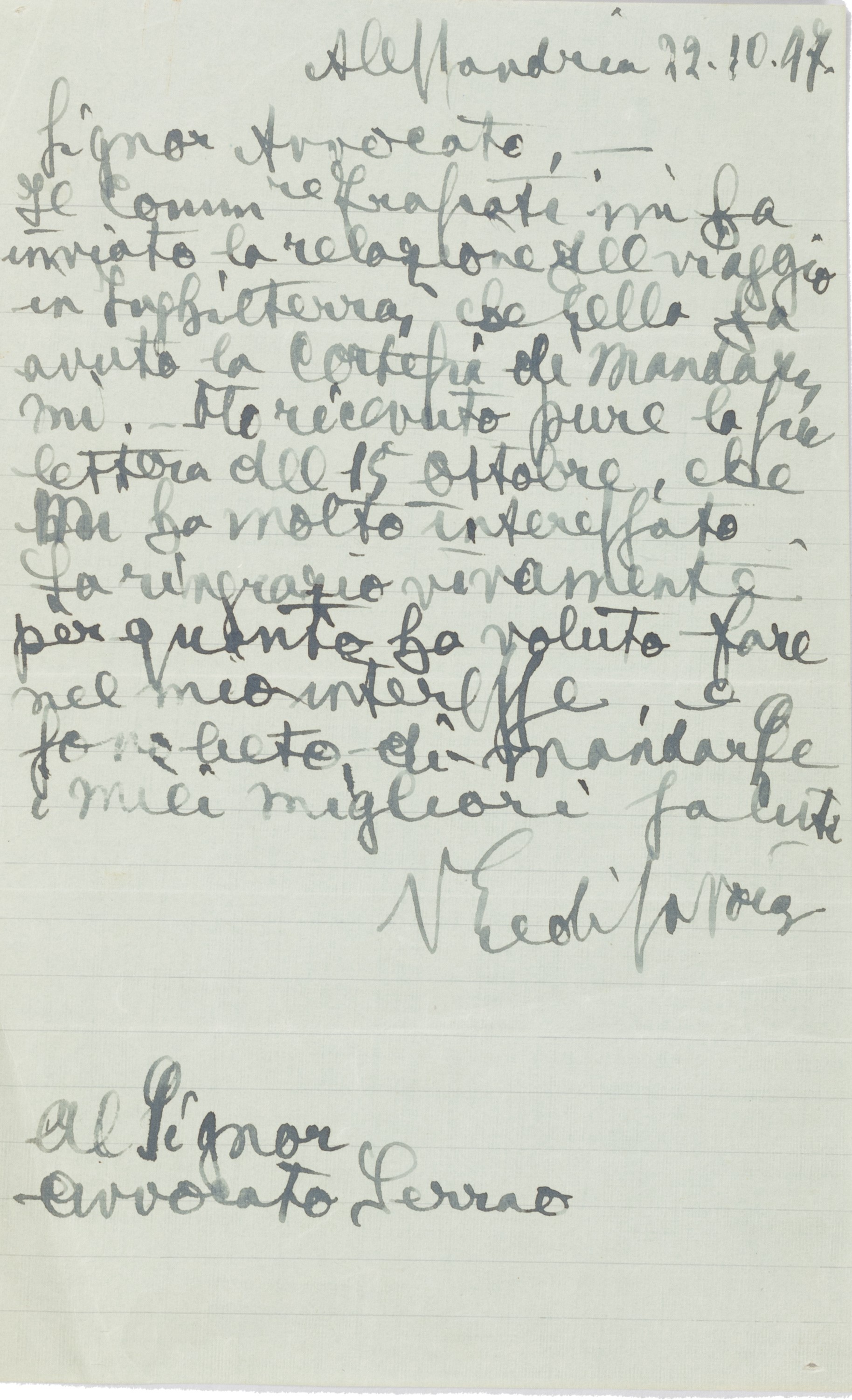 1947 Lettera autografa e formata di una pagina, 200 x 124 mm., datata Alessandria 22.10.97 e indirizzata all'Avvocato Serrao, presumibilmente Giannandrea Serrao, avvocato di casa Savoia datata 1947.