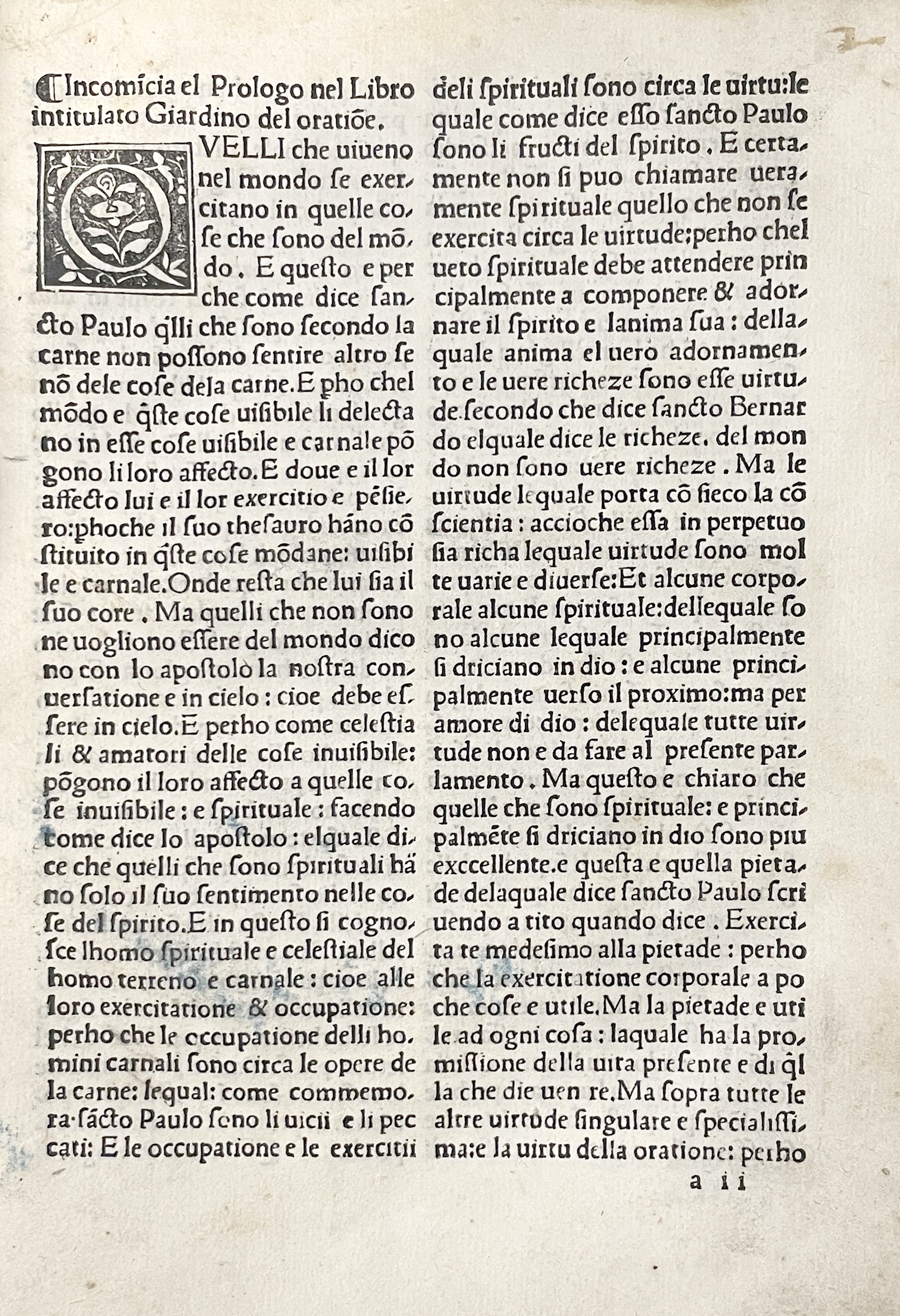 1511 Venezia, 1511. In 4°. Capilettera xilografici, mancante la prima carta, legatura in pergamena floscia del sec.XVII con decorazioni in oro, tagli blu.
