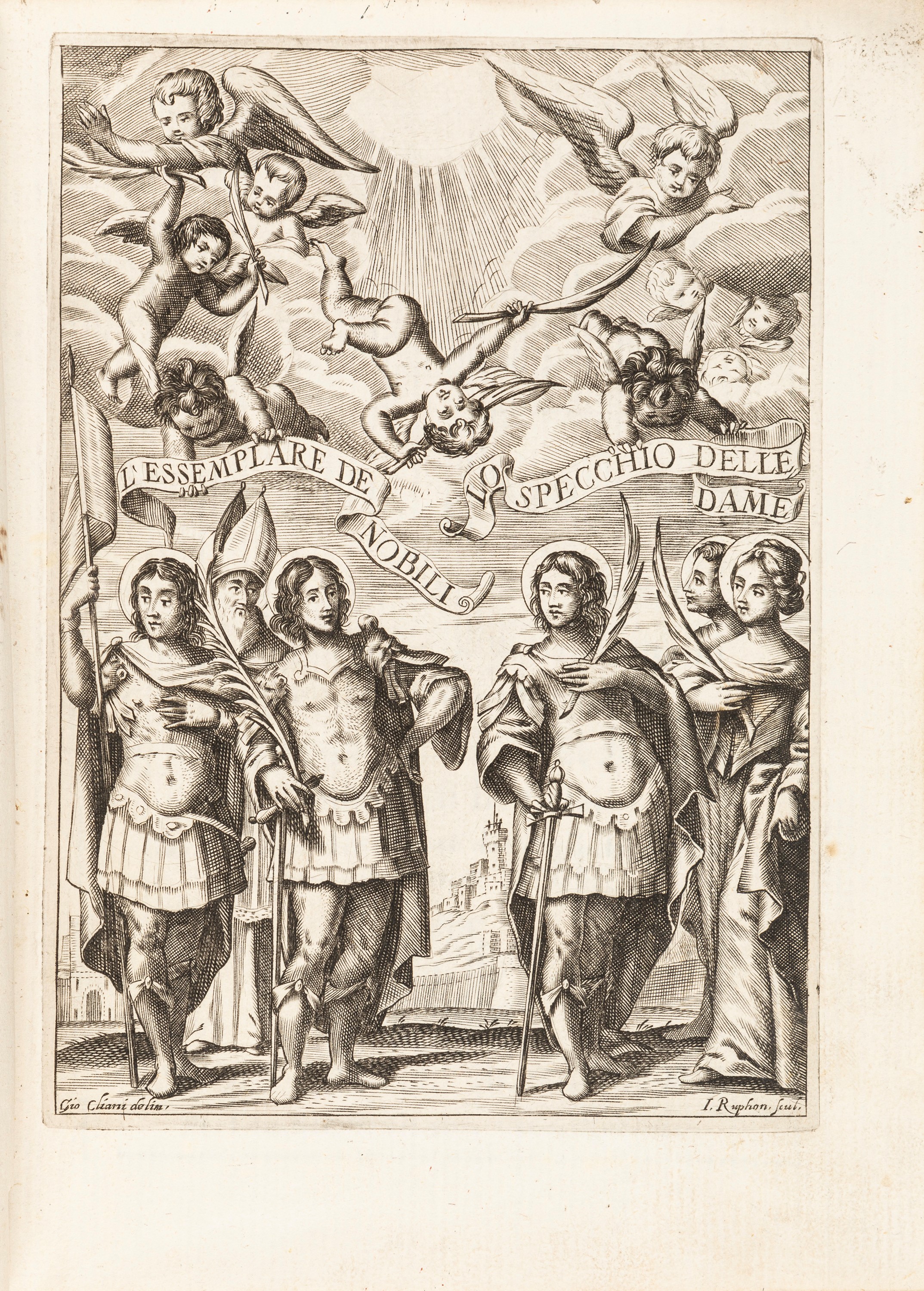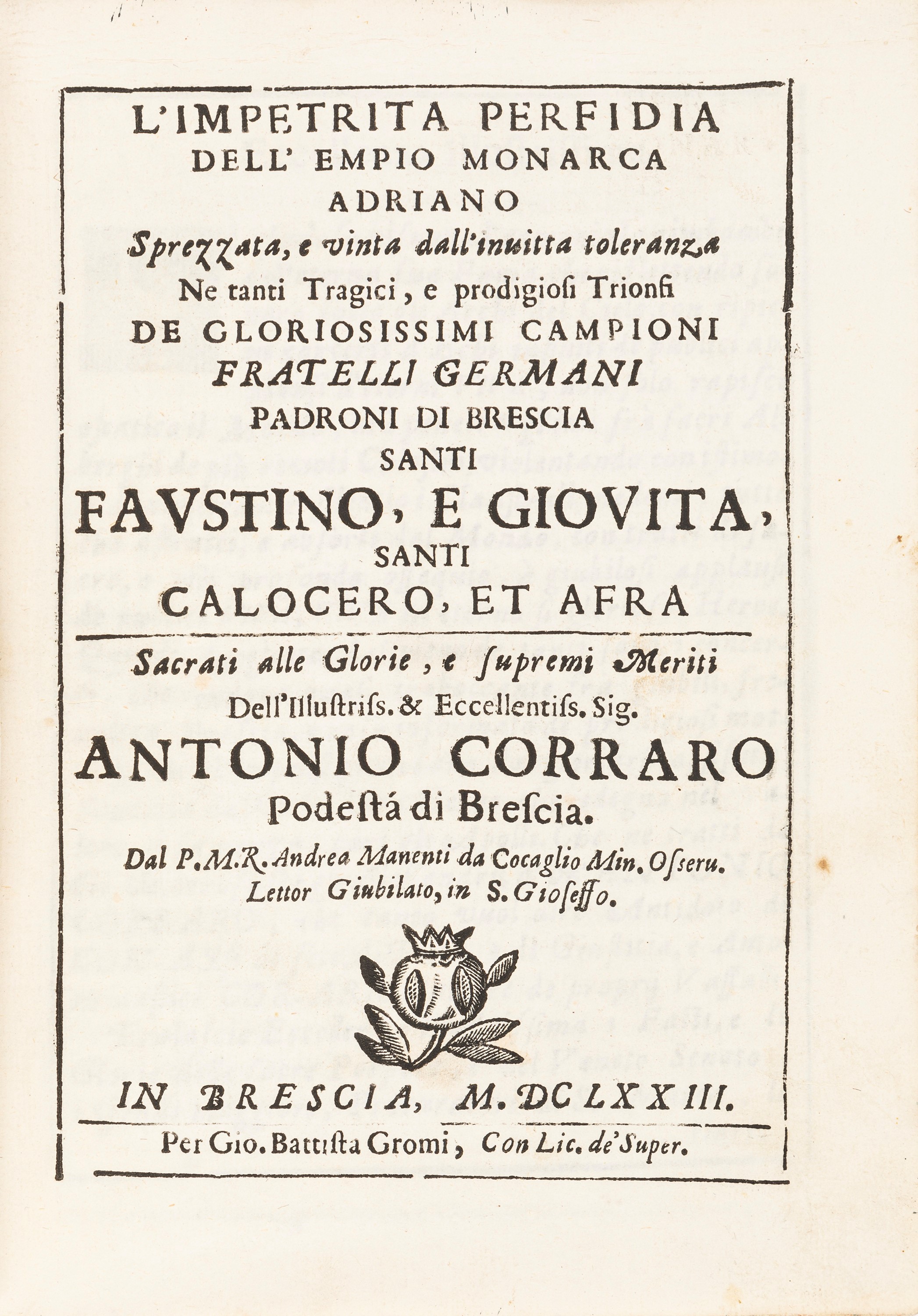1673 Brescia, Gio. Battista Gromi, 1673. In 4°. Vignetta calcografica al frontespizio con il motto Fidelis Brixia Fidei et Iustitiae, antiporta allegorica incisa in rame, con 17 tavole incise in rame fuori testo perlopiù disegnate da Antonio Minotti e incise da Jacopo Ruffoni e una tavola sottocritta I. Ruphon, lievissima gora d'acqua al margine inferiore dei primi fascicoli, piccola macchia al margine bianco di 3L1, legatura coeva in pergamena, tagli a spruzzo, qualche piccola macchia e lieve difetto. Firma di appartenenza al frontespizio.