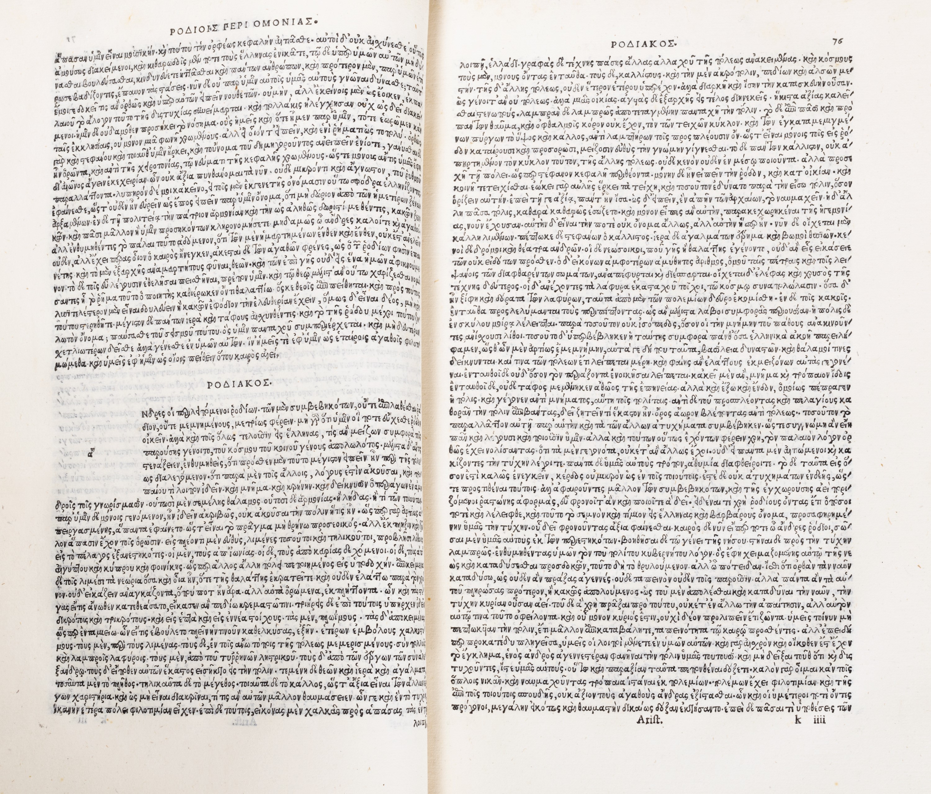 Firenze, Filippo Giunta, 1517. e Basilea, Peter Perna,1566. In 2°. 4 tomi, rilegati insieme, testo in greco e latino spazi per iniziali con letterine guida, mancante la carta 184 con la marca dei Giunta, supplita in fotocopia, fioriture, aloni, macchie, legatura in vitello marrone del sec. XVII con decorazione impressa a secco, al dorso nomi degli autori impressi in oro, piccoli restauri e mancanze.