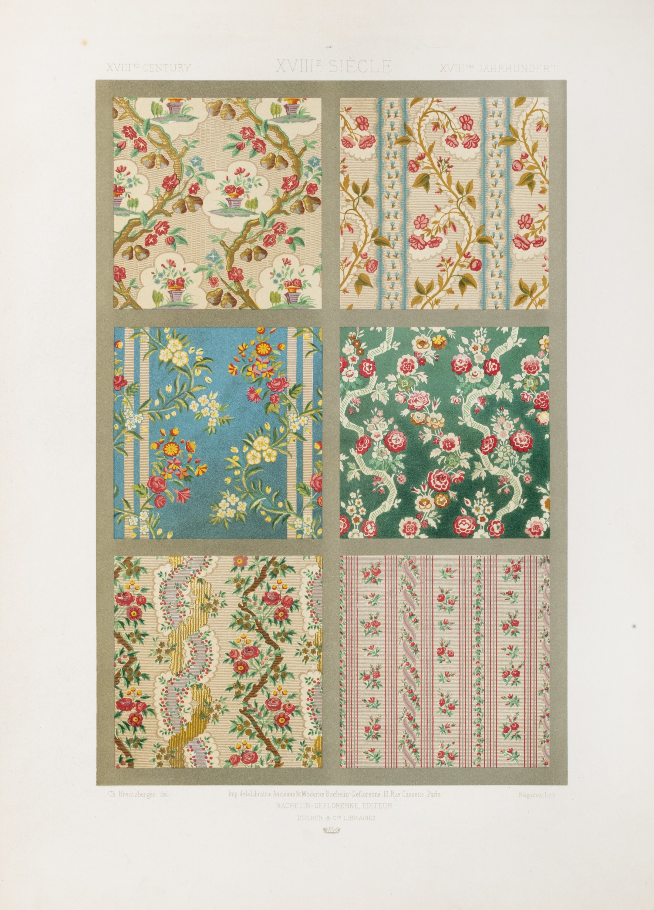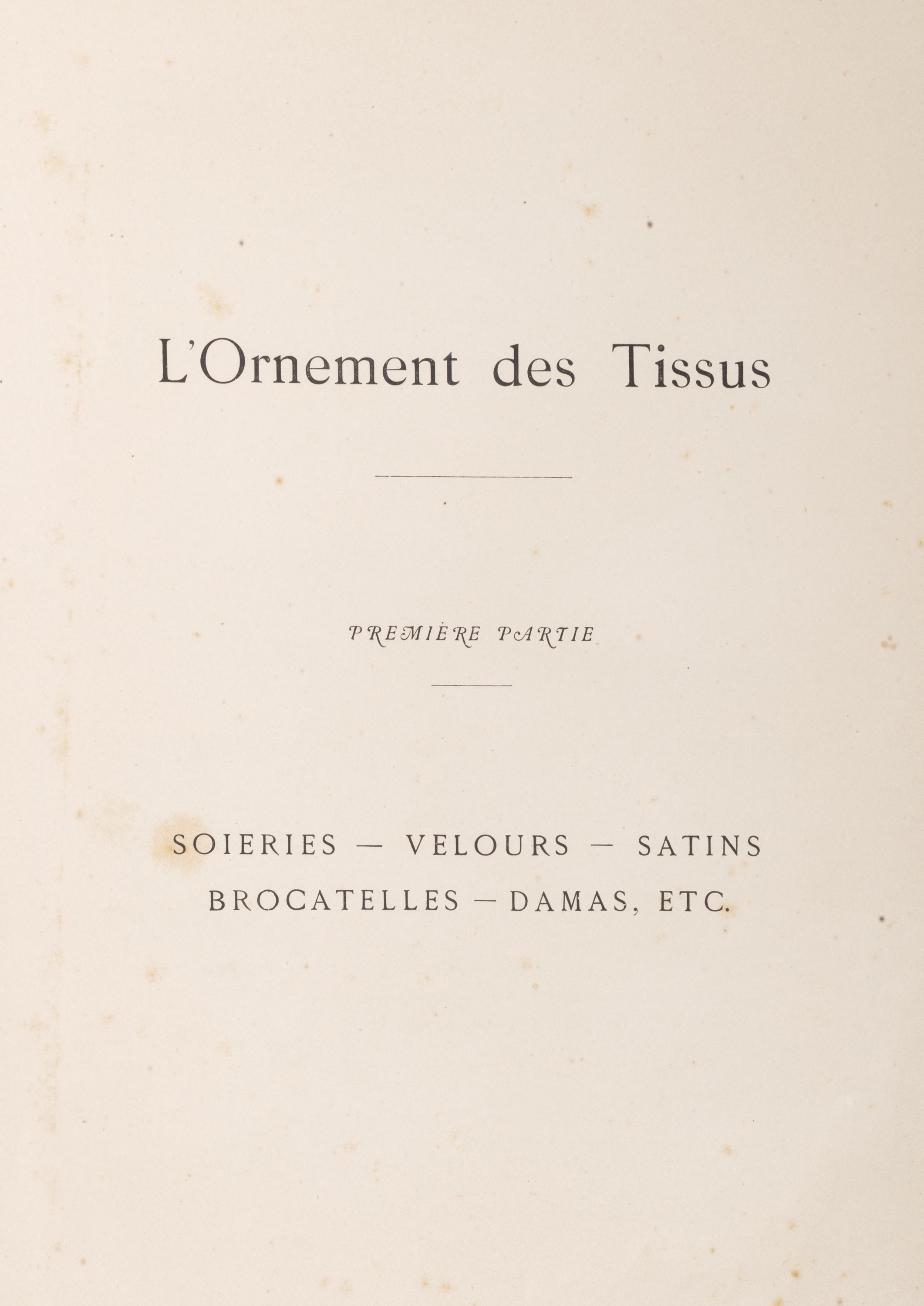 Parigi, Libraire Gènérale de l'Architecture, 1877. In folio. L'opera si compone di dieci fascicoli, ciascuno contenente dieci tavole per un totale di 100 tavole (cm. 42 x 29) impresse in litografia a colori e ritoccate all'acquarello, raffiguranti preziosi tessuti in seta, velluto, broccato, damasco, ecc. di tutte le epoche e di tutti i paesi. Ciascuna tavola è accompagnata da un foglio di testo esplicativo, che indica brevemente le fonti, dove sono disegnati i motivi e lo stile a cui appartengono. Esemplare a fogli sciolti conservato in cartella. Legatura editoriale in tela rossa con legacci di chiusura, titolo e artistica decorazione in oro al piatto, tratta da un dipinto di Hans Holbein.