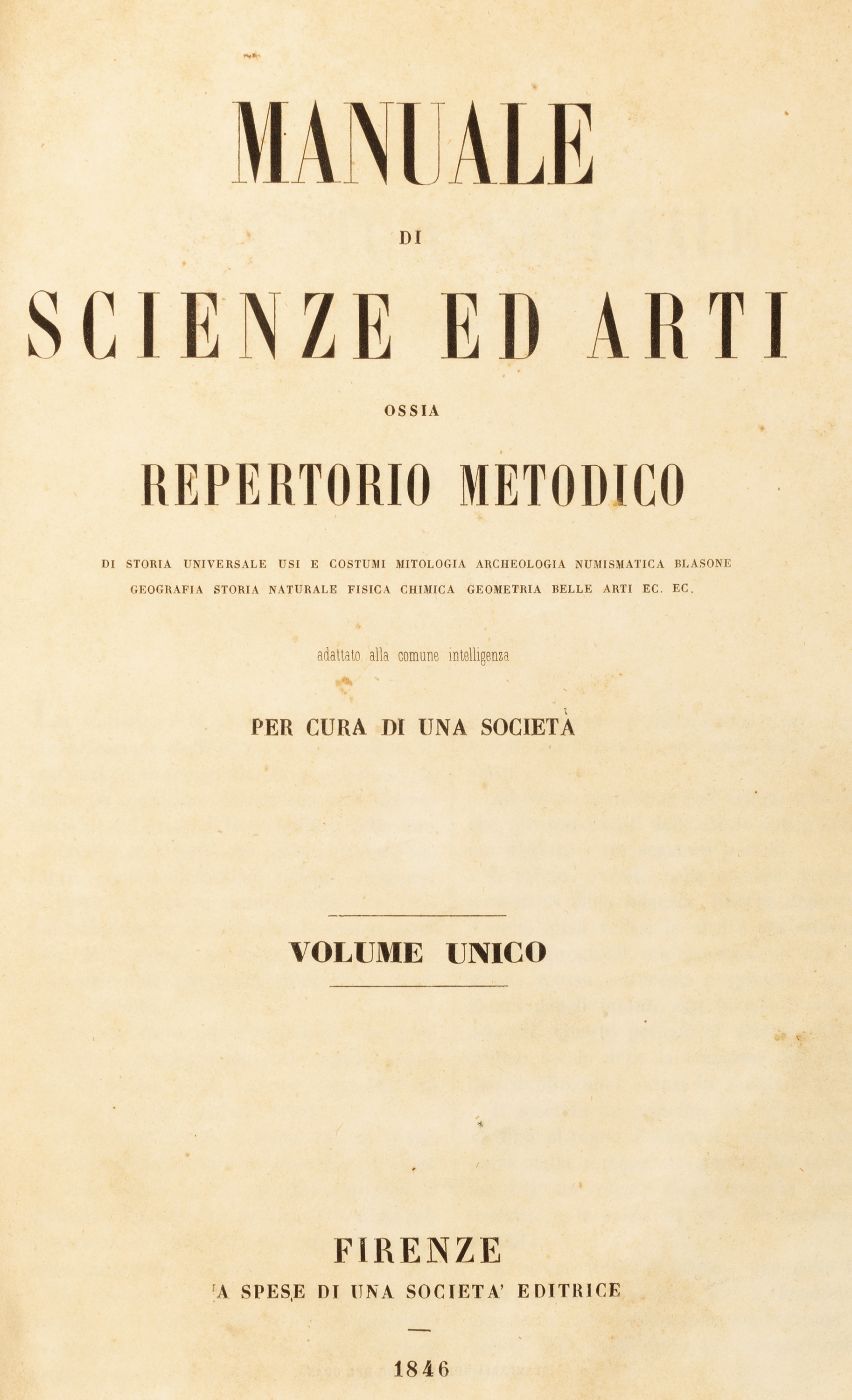 Firenze, 1846. In 4°. 2 voll.(Testo - Tavole). Con 129 tavole incise su rame f.t. raffiguranti vedute di esterni ed interni, monete, medaglie, oggetti di arte antica romana, architettura, zoologia, strumenti scientifici ecc, lievi difetti, legatura coeva in mezza tela con angoli, titolo e fregi in oro al dorso.