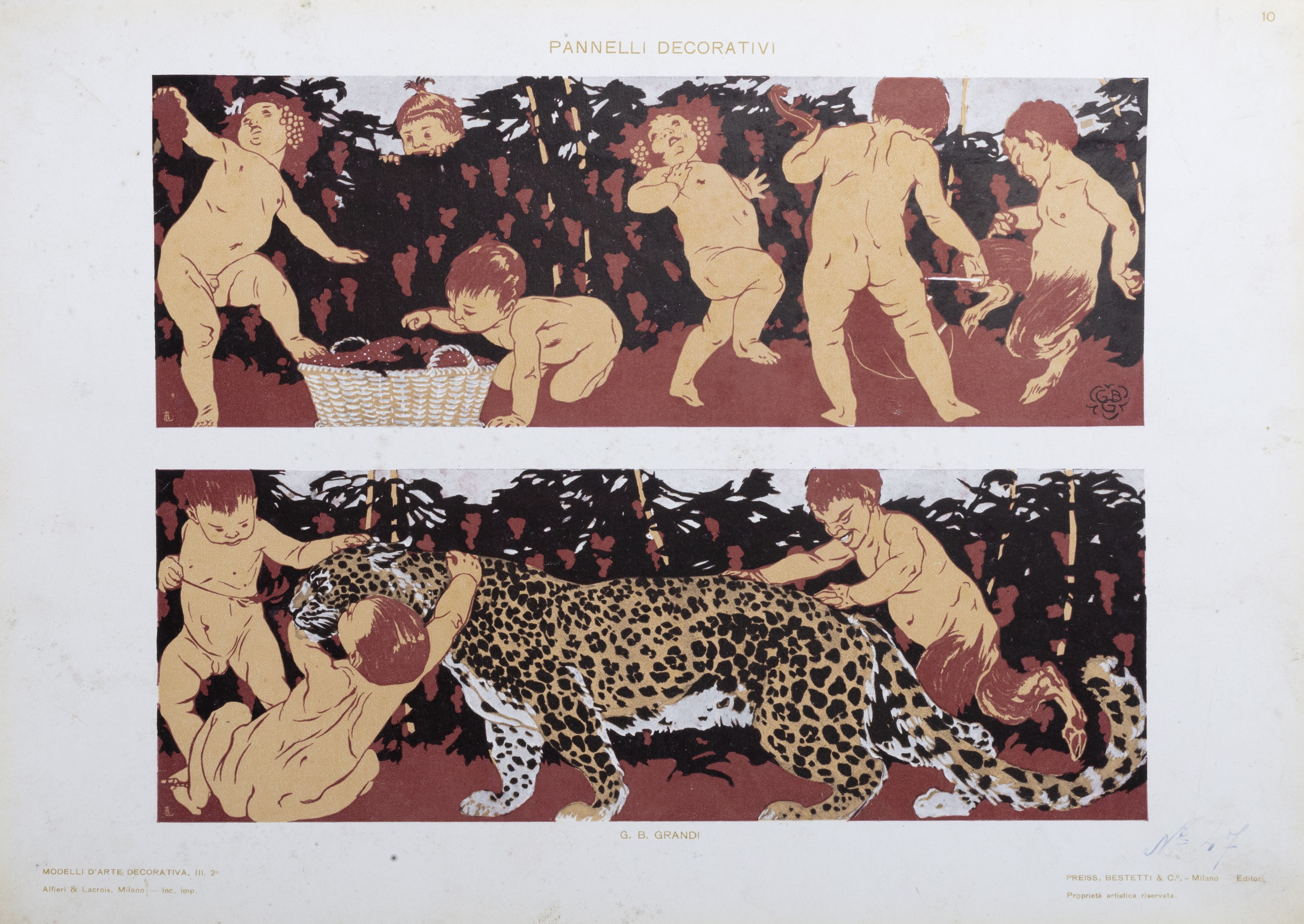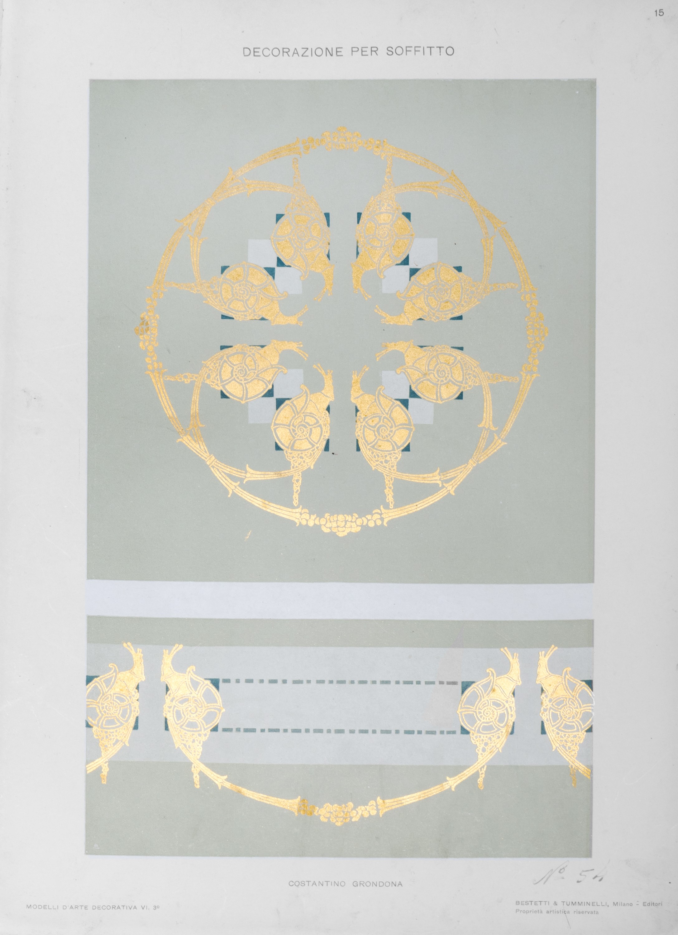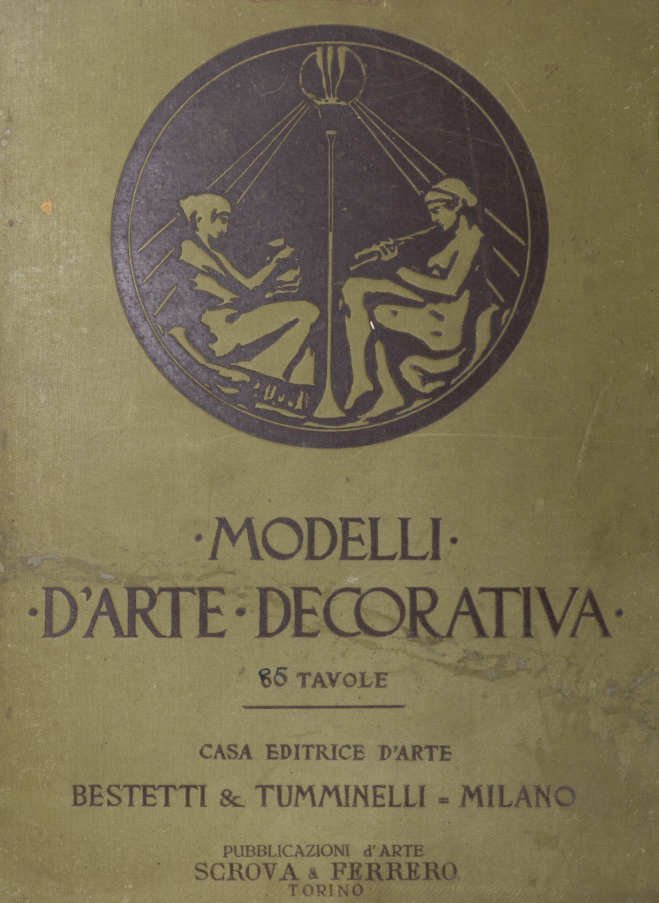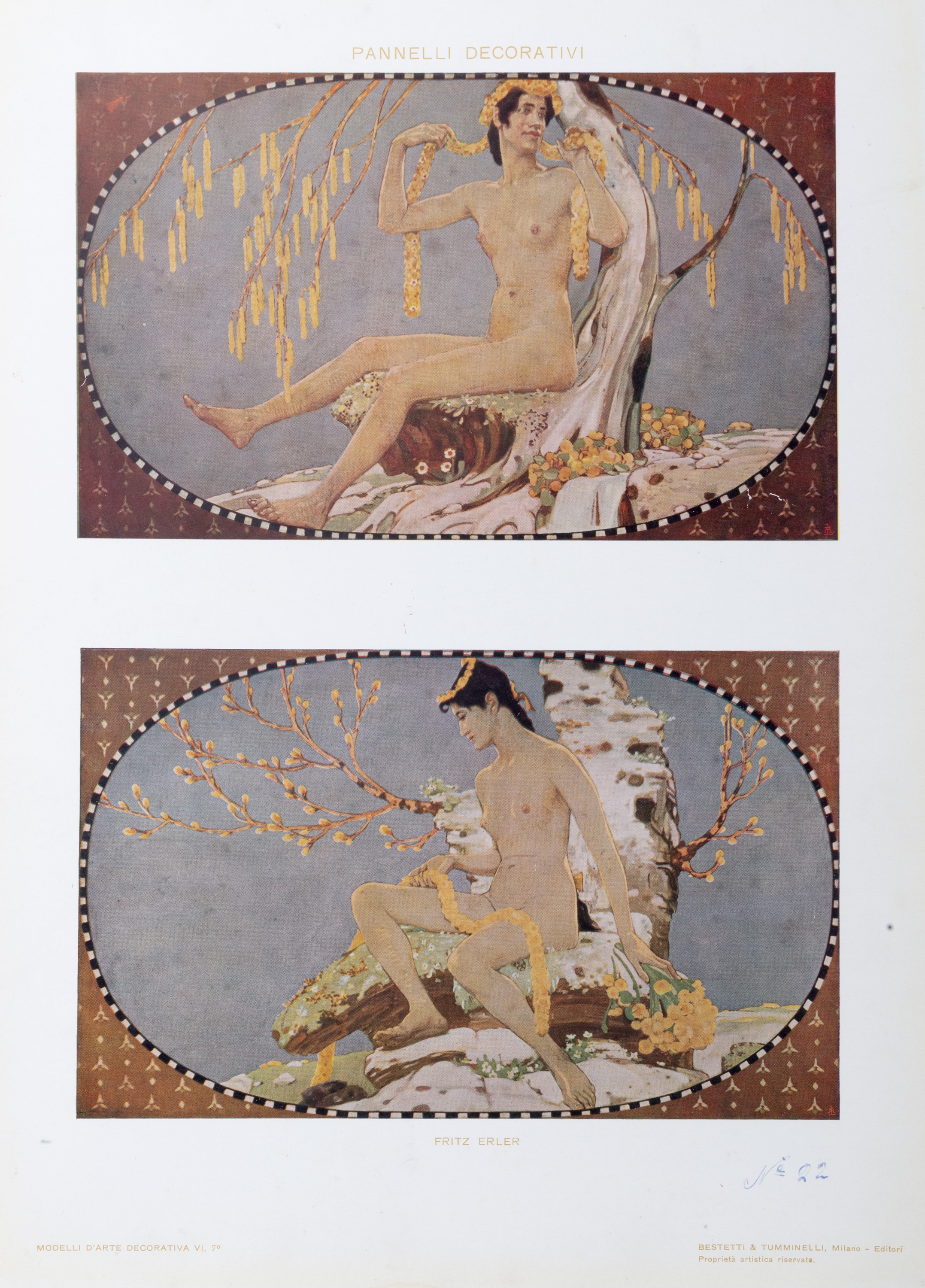 Milano, Casa Editrice d’arte Bestetti & Tumminelli. (1907 - 1910). In 4°. Raccolta di 84 tavole, scelte tra le 6 serie che la casa editrice dedic̣ all'argomento, raffiguranti motivi decorativi in stile liberty di grandi maestri del tempo, quali Sartorio, Palanti, Fiorini, Erler, Roubille, ecc., allegati 14 acquerelli, di cui tre firmati, del noto decoratore pratese Fernando Gualtieri il cui timbro appare sul retro delle tavole. Probabilmente l'insieme costituiva il catalogo di lavoro dell'artista, lievi difetti, cartella editoriale in tela con legacci di chiusura, titolo in nero al piatto.
