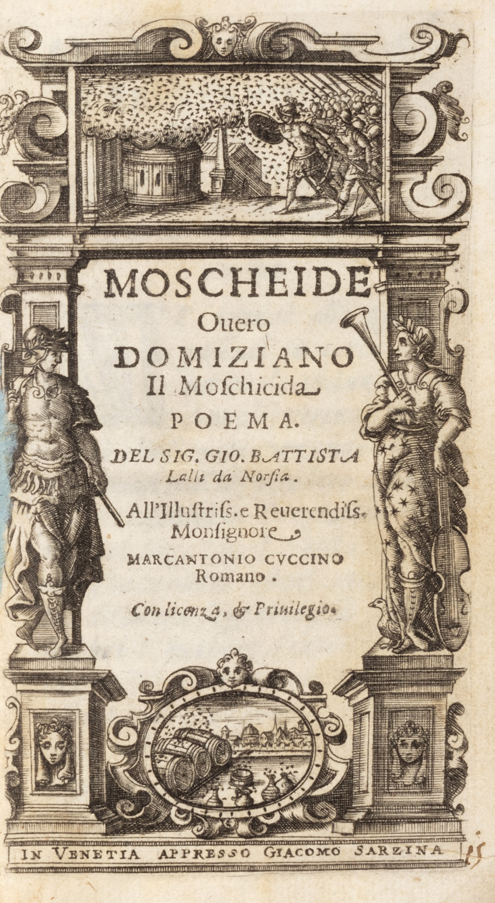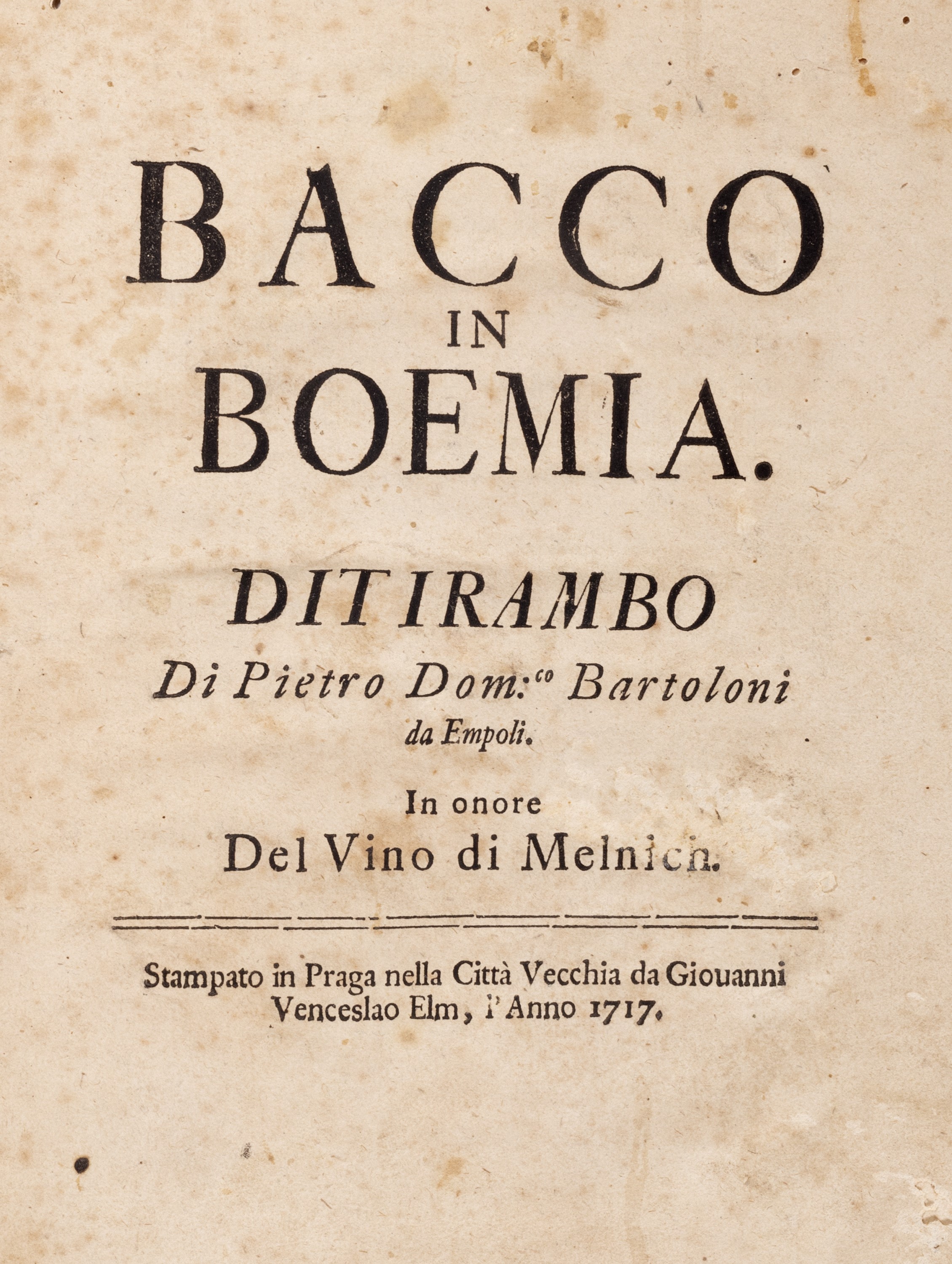 1624 Venezia, Giacomo Sarzina, 1624. In 12°. Frontespizio inciso in rame entro cornice architettonica, iniziali e fregi xilografici, qualche lieve arrossatura, legatura di epoca successiva in mezza tela, autore e titolo impressi in oro al dorso, lievi difetti. § Insieme nel lotto Bartoloni Pietro Domenico, Bacco in Boemia. Ditirambo [...] in onore del vino di Melnich, Praga, Giovanni Venceslao Elm, 1717. In 4°. Esemplare con leggera brunitura, alcuni fori di tarlo, legatura coeva in mezza pergamena, titolo in oro entro tassello al dorso, sciupata, difetti.