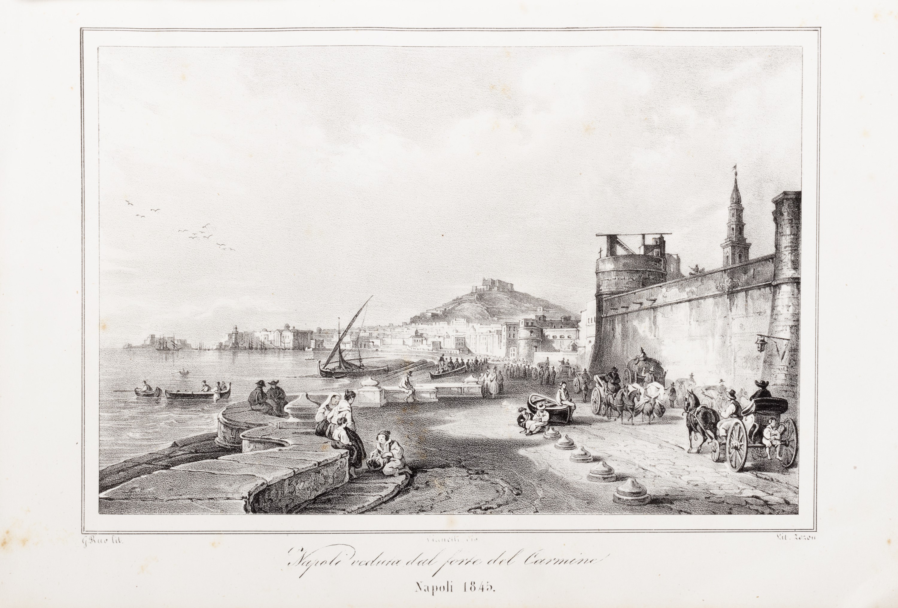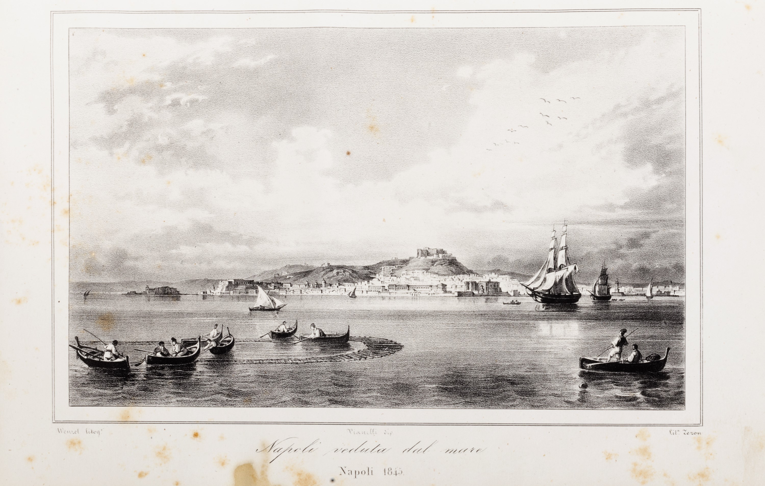 Napoli, Stabilimento Tipografico di Gaetano Nobile, 1845. In 4°, voll. 2, pp. (12)-542; (4)-602 con 25 tavole litografiche di F. Wenzel e A. Zezon su disegno di Achille Vianelli raffiguranti paesaggi, vedute e monumenti della città e 3 grandi piante topografiche ripiegate f.t. (Napoli - Dintorni di Napoli - Pompei), lievi difetti. Legatura editoriale, mancanza alla cuffia di un volume.