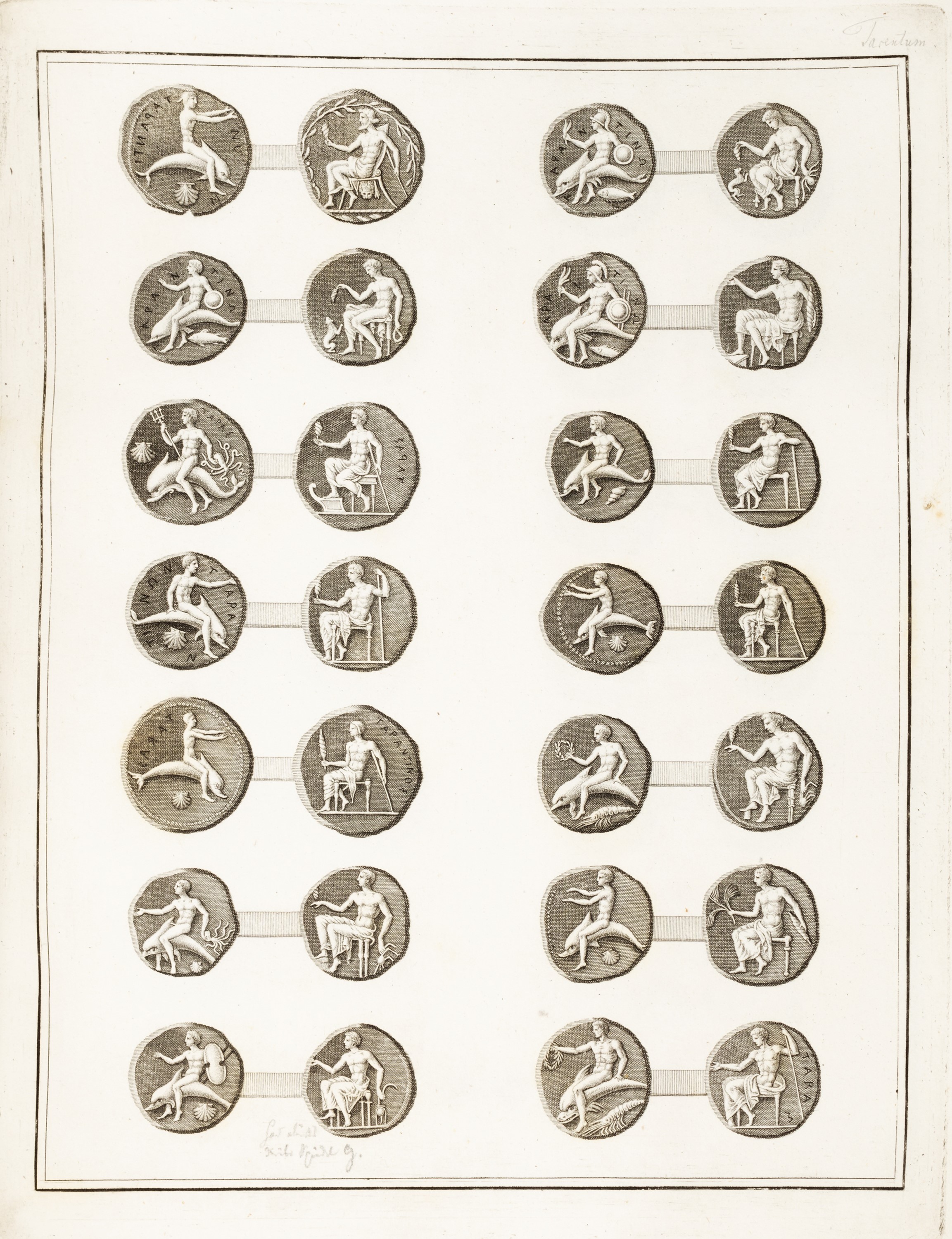 1812 Napoli, s.e., 1812. In 2°. Legato con, dello stesso autore, Numorum veterum Italiae descriptionem adnotationes. Accessit de Neapolitanorum numo anecdoto epistola ad cl. v. Niebuhrium Napoli, A. Tramater, 1834. Con 200 tavole incise in rame, alcune veline con monete manoscritte applicate a qualche tavola, carta di guardia manoscritta, lievi fioriture, legatura coeva in mezza pelle, autore e titolo impressi in oro al dorso, legatura staccata dal corpo del libro, diversi restauri con scotch, difetti.