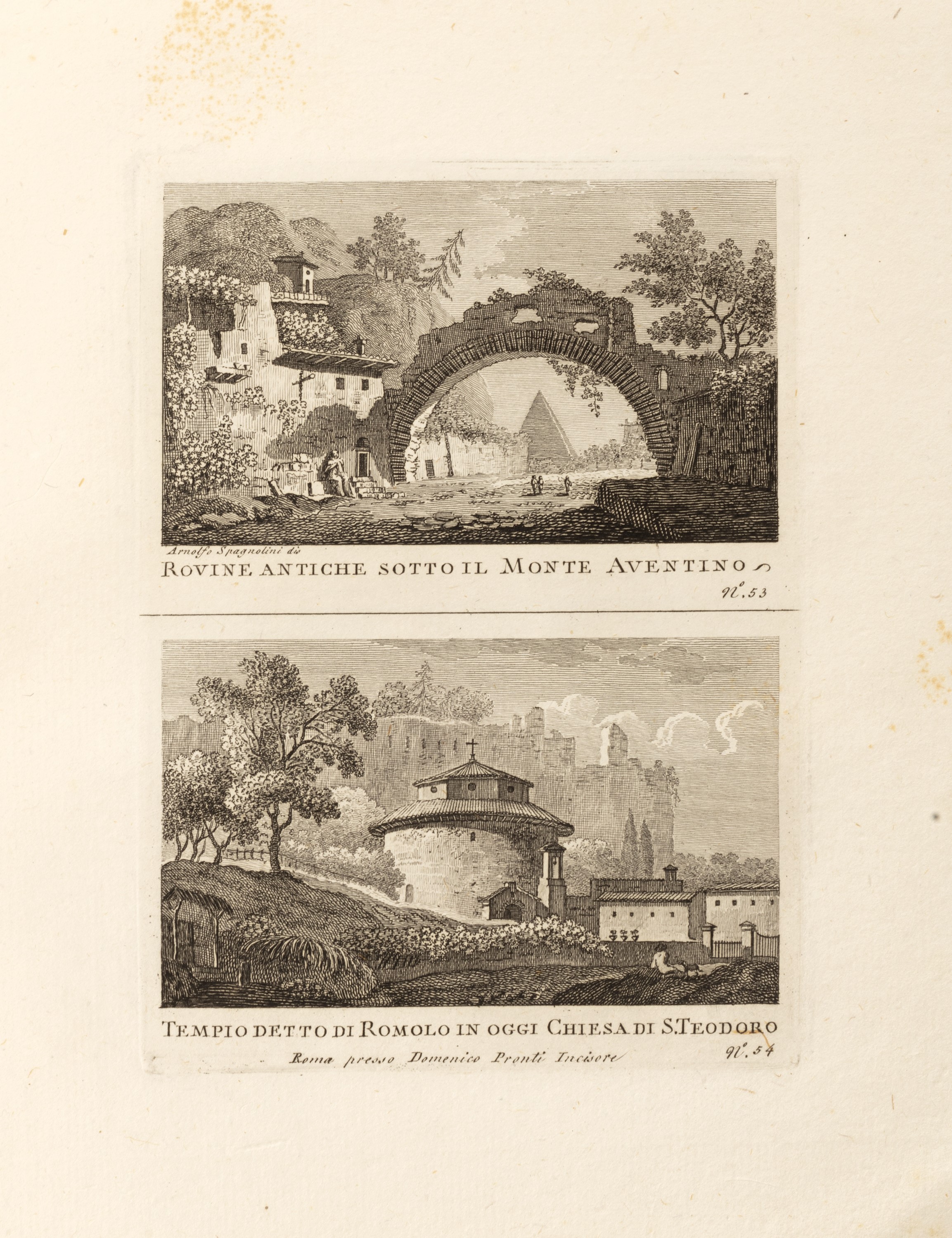 Roma, Domenico Pronti, [1795]. In 4°. voll. 2, due frontespizi con vignetta raffigurante una veduta della città e 170 artistiche vedute (2 su ogni foglio) il tutto inciso su rame, lievi difetti, contenute in una cartella dei primi del '900, tassello con titolo in oro al dorso.