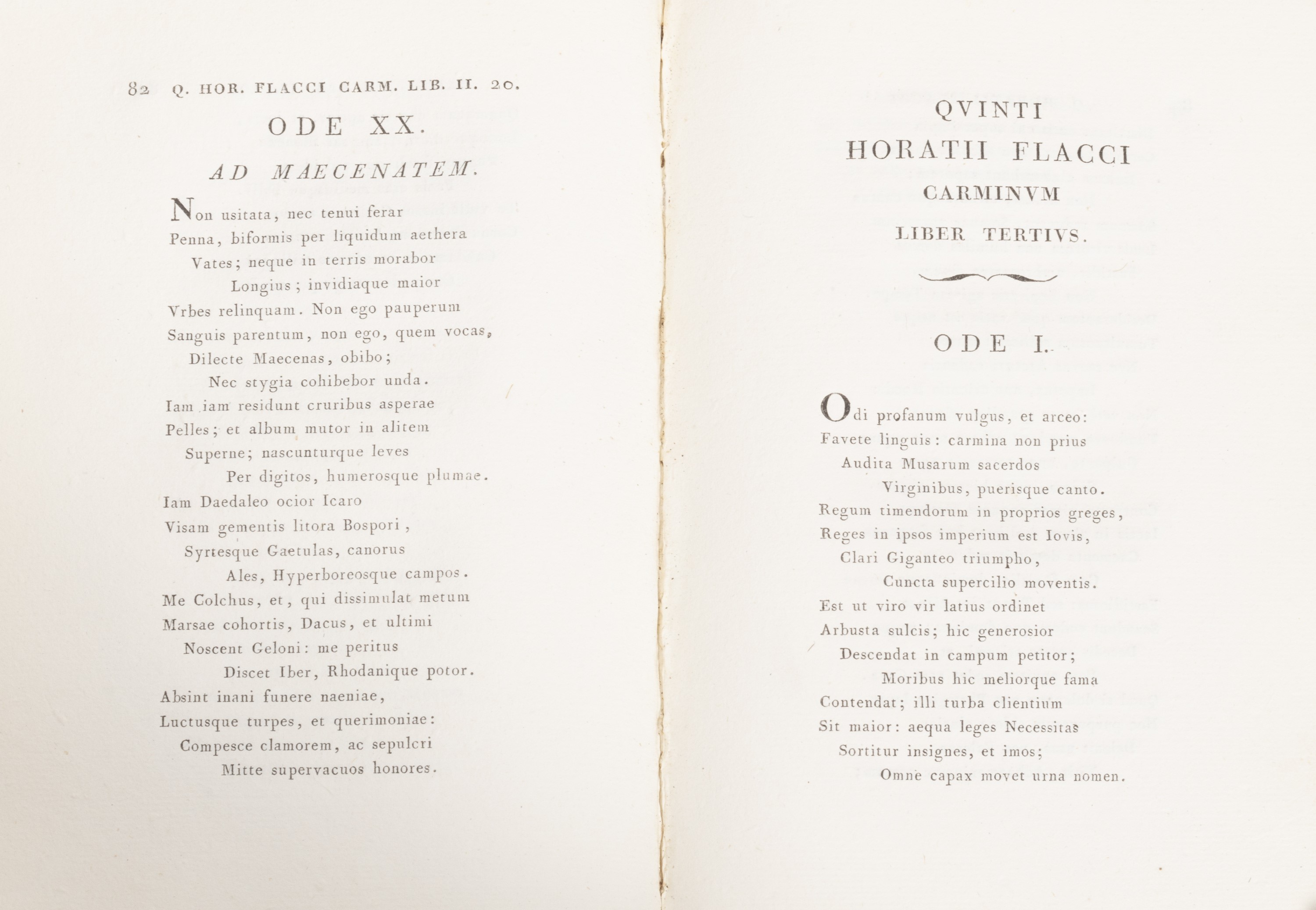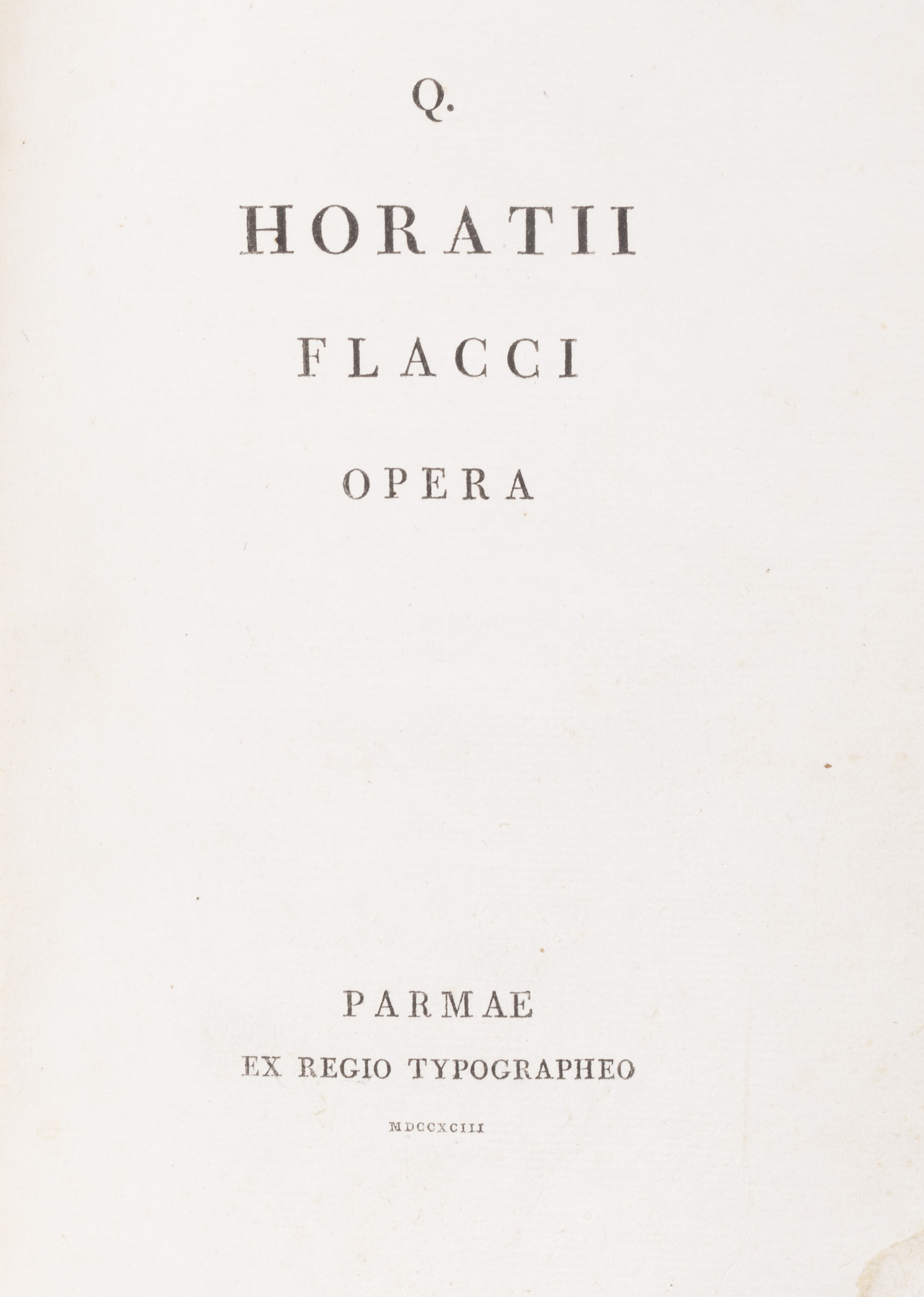 Parma, Giambattista Bodoni, 1793. In 4°. Bella legatura coeva in pelle, piatti inquadrati da cornice impressa in oro, titolo e autore impressi in oro entro tassello al dorso a 5 nervi con fregi floreali, tagli a spruzzo rossi, pochi fori di tarlo al dorso, qualche leggera abrasione.