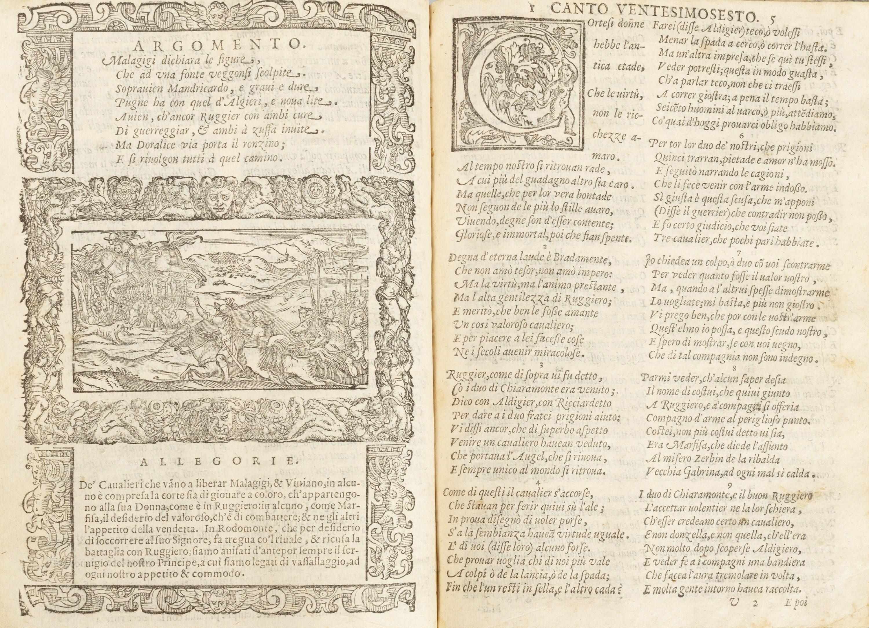 1607 Venezia, Evangelista Deuchino, 1607. Frontespizio entro bella cornice xilografica, fregi, iniziali e numerose vignette incise in legno, fioriture sparse, qualche gora d'acqua e piccola macchia, legera brunitura, legatura in piena pergamena, titolo in oro entro tassello rosso al dorso con fregi, lievi difetti.