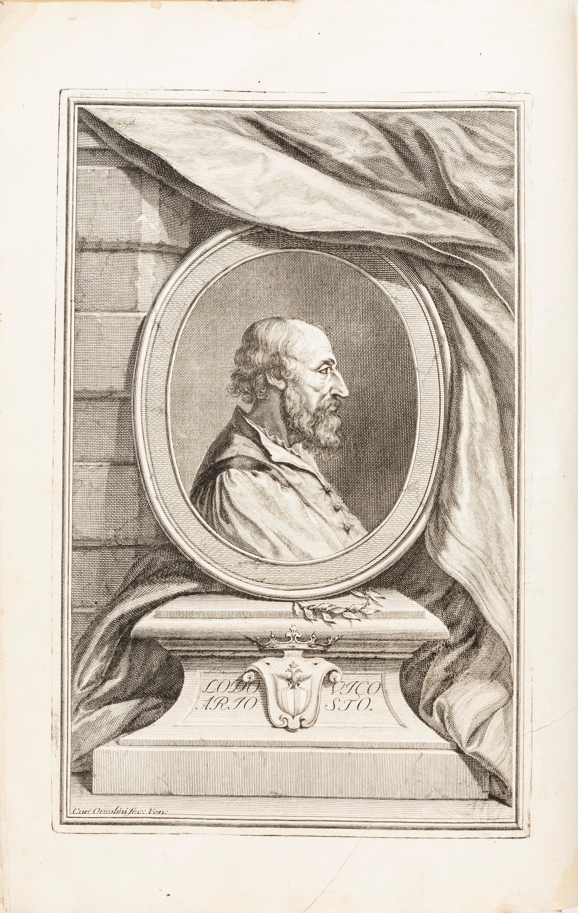 1730 Venezia, Stefano Orlandini, 1730. In 2° in due parti, con relativi frontespizi. Ritratto calcografico dell’Ariosto inciso da Caro Orsolini in antiporta, frontespizio in rosso e nero con vignetta calcografica che raffigura impresa ariostesca (fuoco che scaccia api dall'arnia, motto: Pro bono malum). 46 tavole calcografiche (una all’inizio di ogni canto). II parte: Opere di m. Lodovico Ariosto in questa impressione esattamente raccolte, e di scelte annotazioni adornate, tomo secondo, che contiene i Cinque canti, che seguono la materia del Furioso […]. Frontespizio entro cornice calcografica e 5 tavole calcografiche, il tutto inciso da Giuseppe Filosi. A carta Z1r occhietto “Commedie […]” in cornice xilografica. Legatura in mezza pergamena e cartone marmorizzato. Timbro al frontespizio del libraio bresciano Angelo Delai.