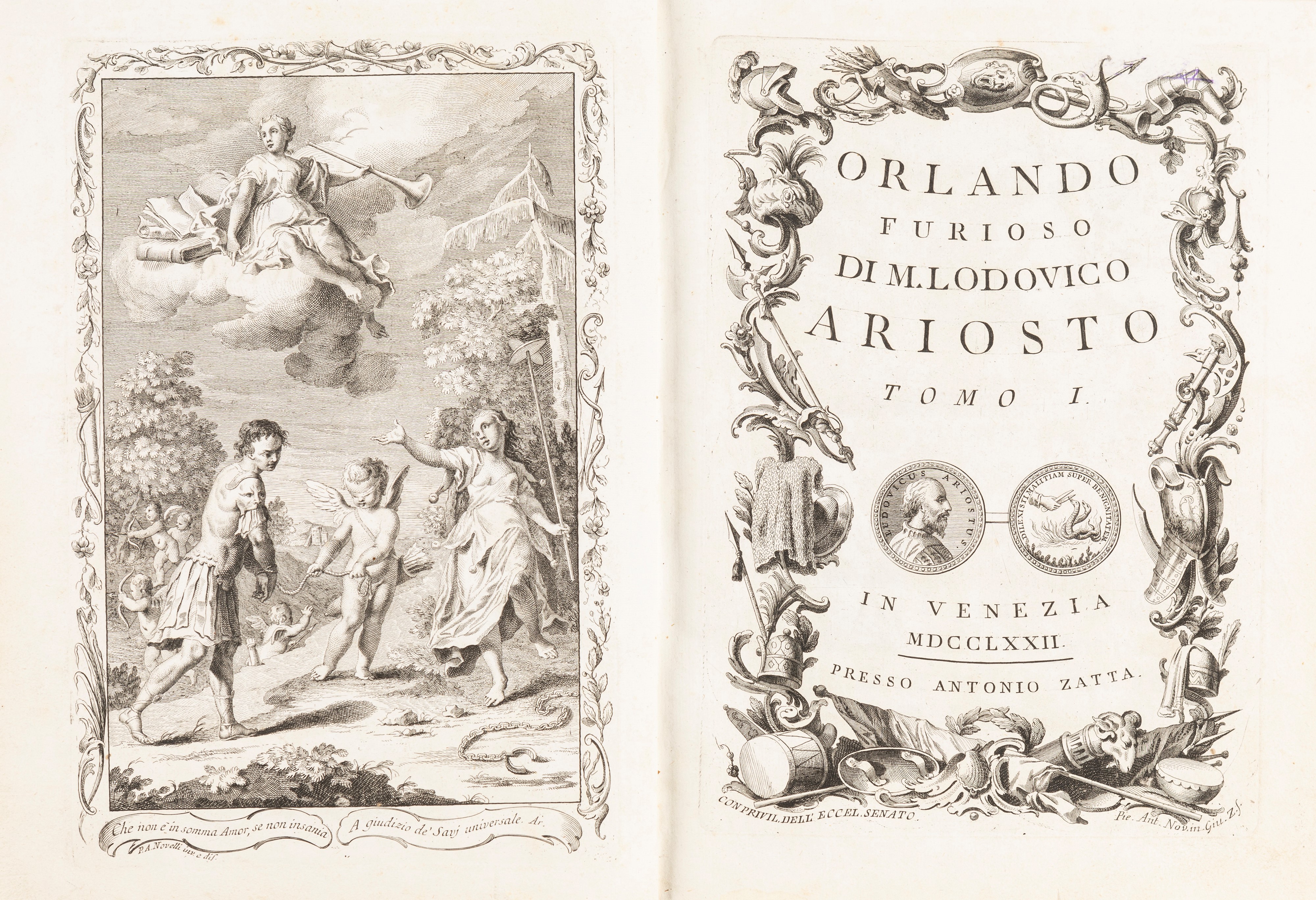 1772 Venezia, presso Antonio Zatta, 1772. In 4°. 4 voll. con 58 splendide incisioni in rame a piena pagina, per un totale di 62 tavole, se si aggiungono i frontespizi incisi. Incisioni di Giuliano Zuliani, Tommaso Baratti, Ferdinando Fambrini, Giacomo Malosso e altri, su soggetti di Pietro Antonio Novelli, ecc., 51 quadri degli argomenti (46 canti + 5 canti rivisti) con testo anch'esso inciso, 51 capilettera finemente istoriati, 51 tra finalini e culs-de-lampe, legatura coeva in mezzo vitello marrone e cartone maculato, tagli gialli. esemplare perfetto.