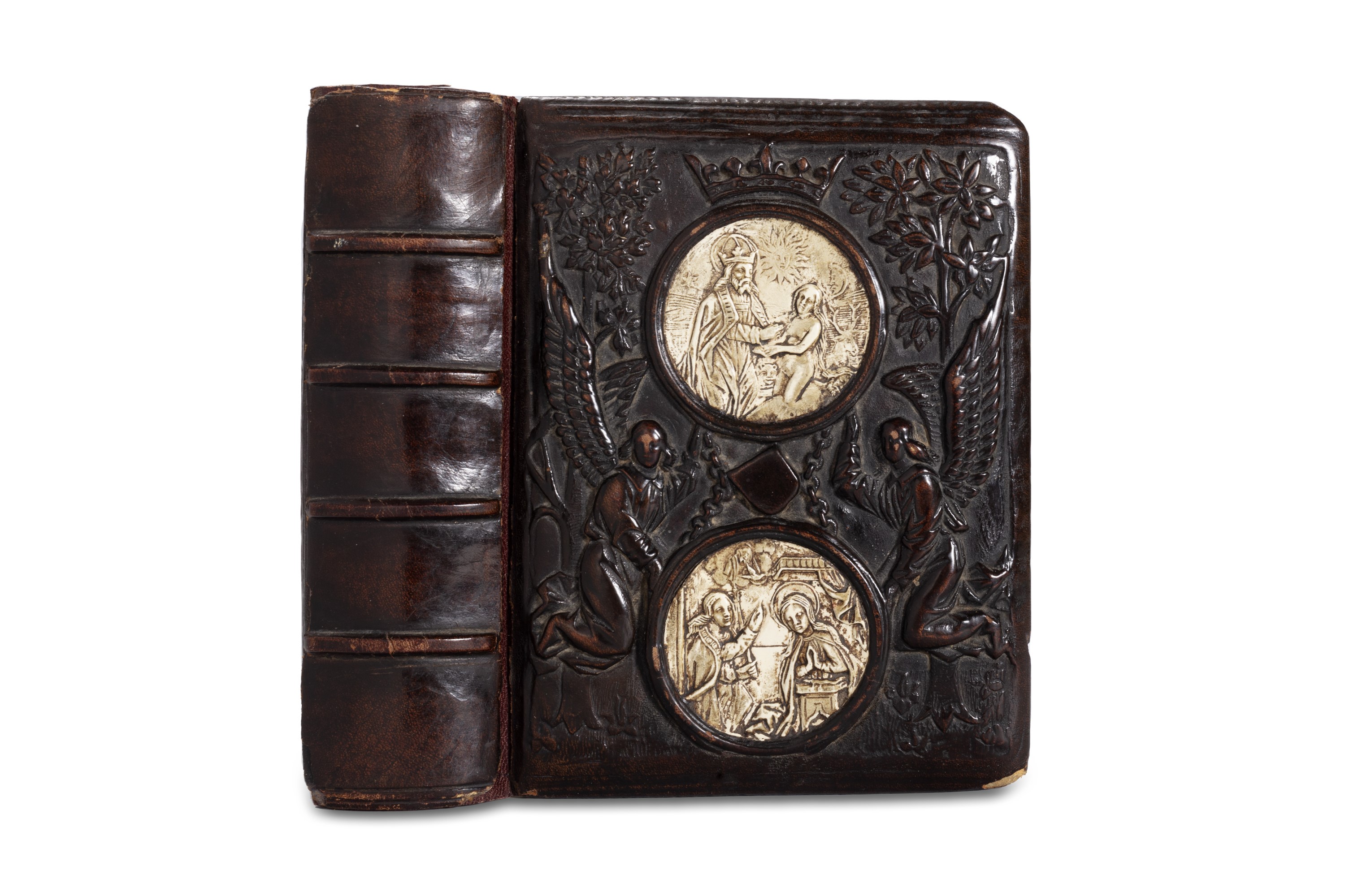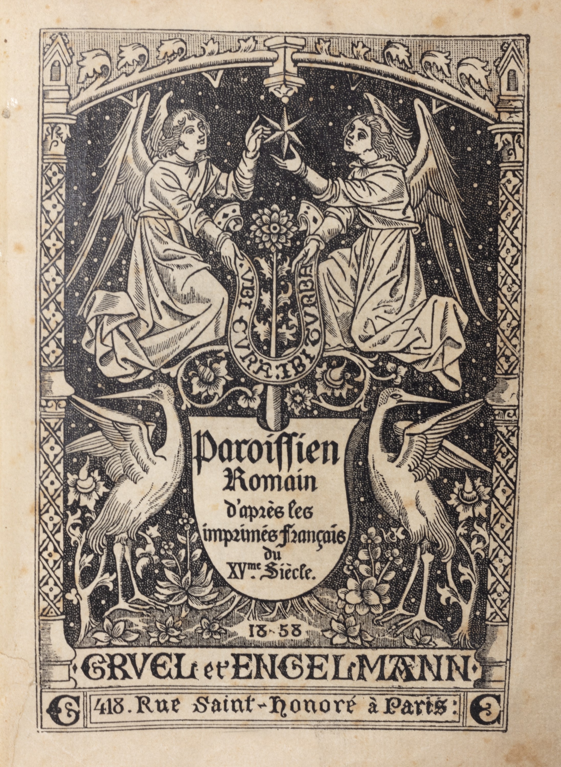 Parigi, Gruel & Engelmann, 1858. In 16°, pp. 794, testo racchiuso in eleganti cornici incise su rame, con 33 tavole, sempre incise su rame e racchiuse in cornice, allegorie delle principali feste che cadono durante l'anno. LEGATURA coeva della bottega di LEON GRUEL (abilmente restaurata) in piena pelle marrone; piatto superiore, bombato, ornato a rilievo da motivi floreali e da due angeli che sorreggono due cammei in osso raffiguranti scene storiche, il tutto sormontato da una corona reale; piatto inferiore ornato da una serie di cornici a motivi geometrici e floreali che racchiudono una scena biblica; tagli colorati.