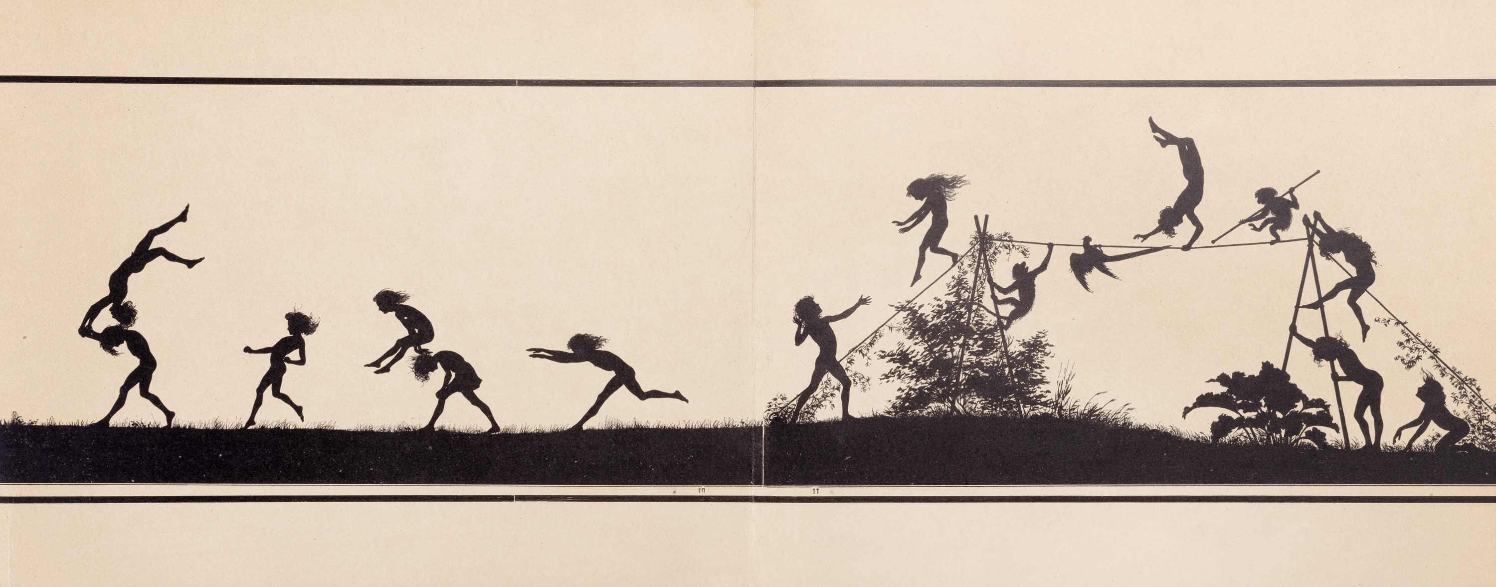 8° oblungo, 13 pagine di testo e 34 xilografie ripiegate a soffietto che formano un’unica lunga tavola che misura metri 8,25. Legatura editoriale in tela con illustrazione al piatto. Lievi difetti.