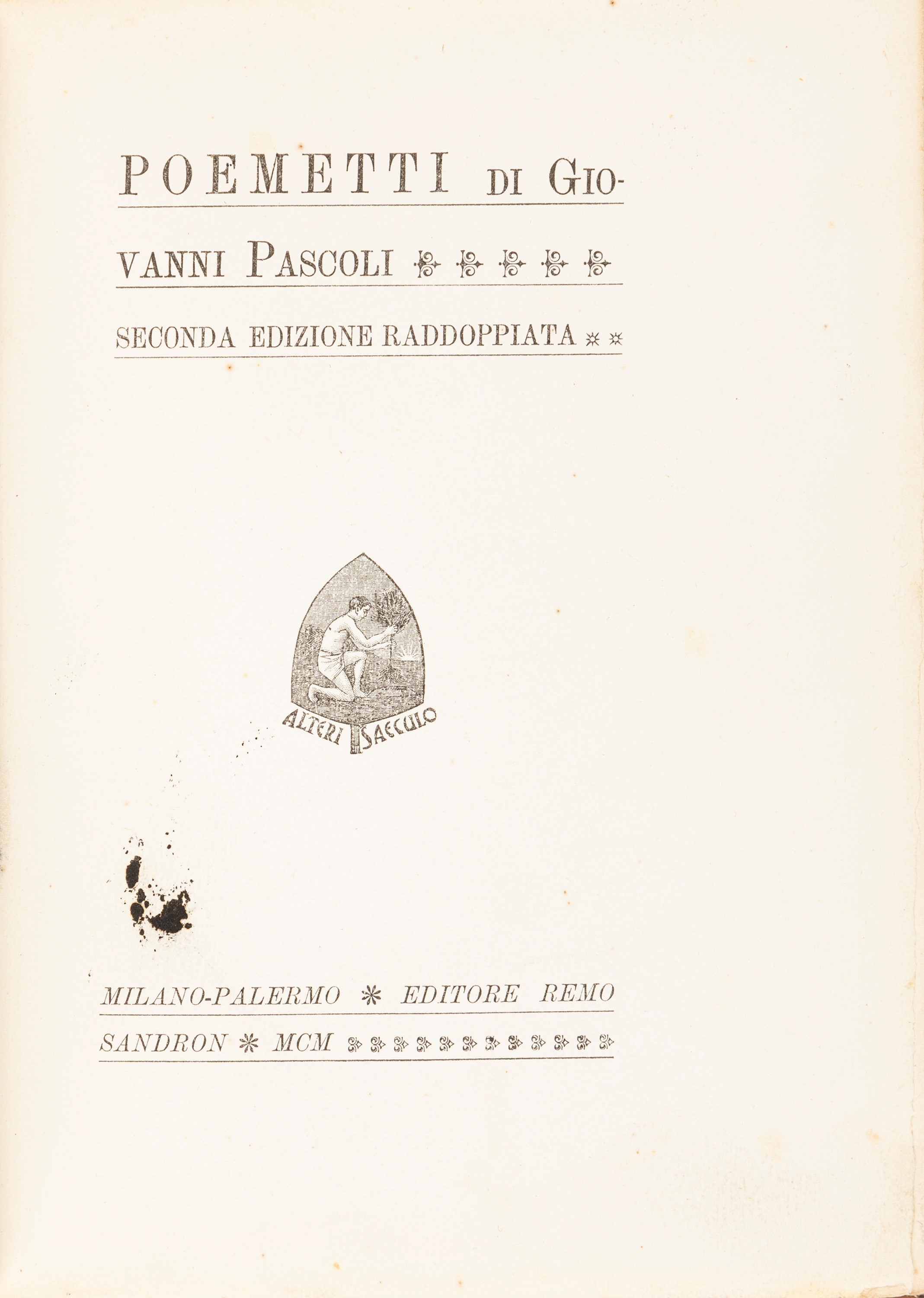 1900 Milano -Palermo, Editore Remo Sandron, 1900. Marca tipografica al frontespizio, qualche arrossatura, macchia di inchiostro al frontespizio, pp.77-80 con pieghe, legatura in vitello dell'epoca con ai piatti carta marmorizzata, ai comparti del dorso fregi impressi a secco, lievi difetti.