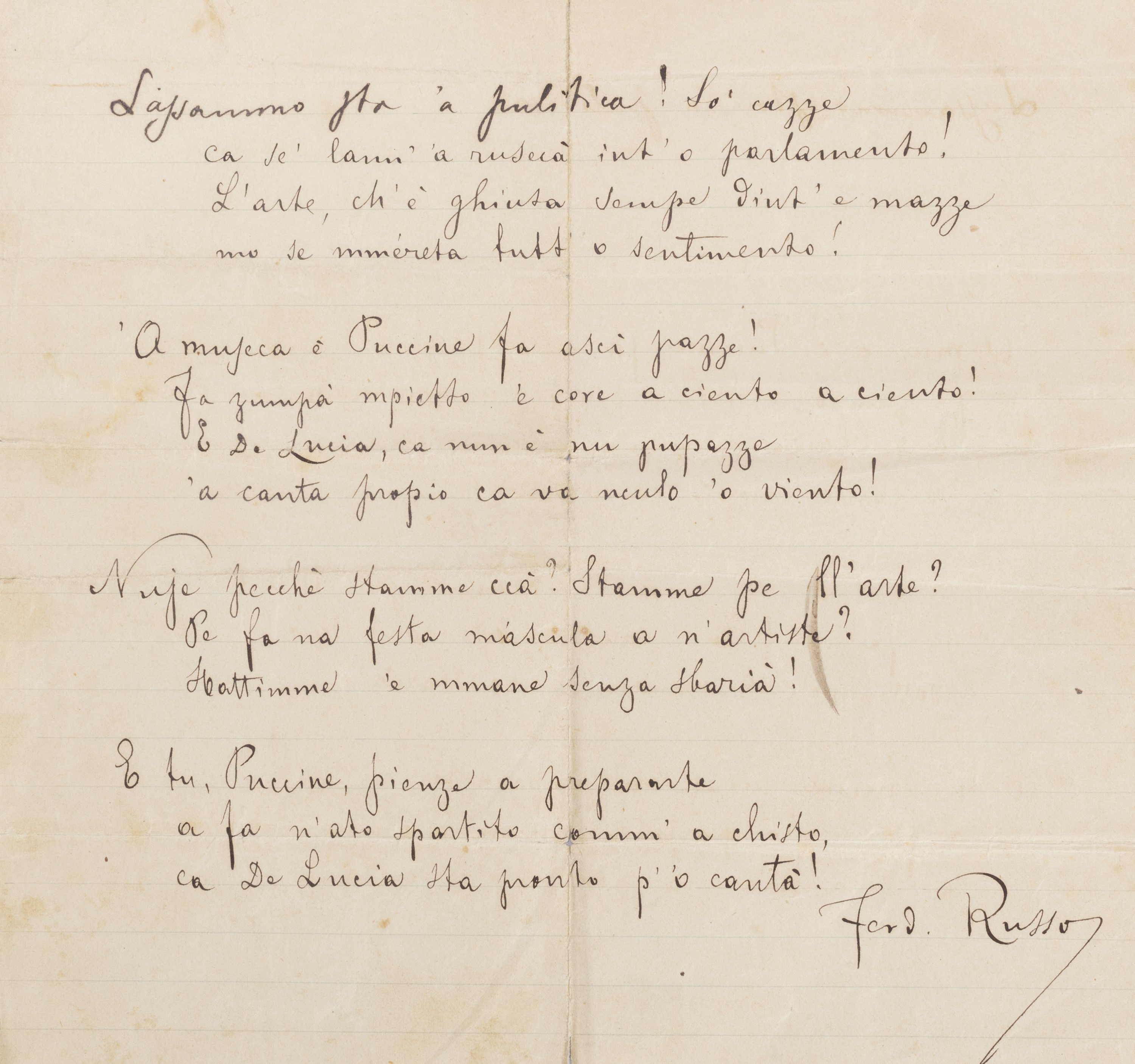 1910 Bel sonetto autografo e firmato di Ferdinando Russo, 200 x 210 mm., a rime alterne baciate ABAB ABAB CDE CDE, insieme un bell'articolo di pugno di Russo, da lui firmato, dal titolo Divagazione di stagione Teatro Dialettale di 22 pagine numerate, 330 x 120 mm. (lo strano formato verticale usato ai primi del Novecento soprattutto in ambito giornalistico).