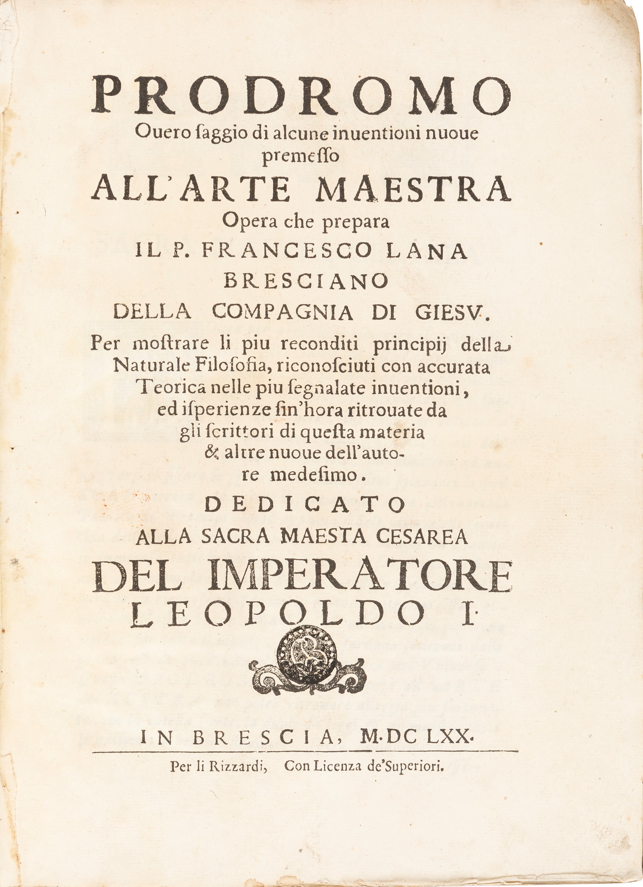1670 Brescia Rizzardi, 1670. In 2°. Testatine e capilettera figurati incisi in legno, 20 tavole incise in rame a piena pagina in fine, fra le quali la tavola della famosa nave aerostatica, aloni, legatura coeva in cartonato alla rustica, macchie e strappi.