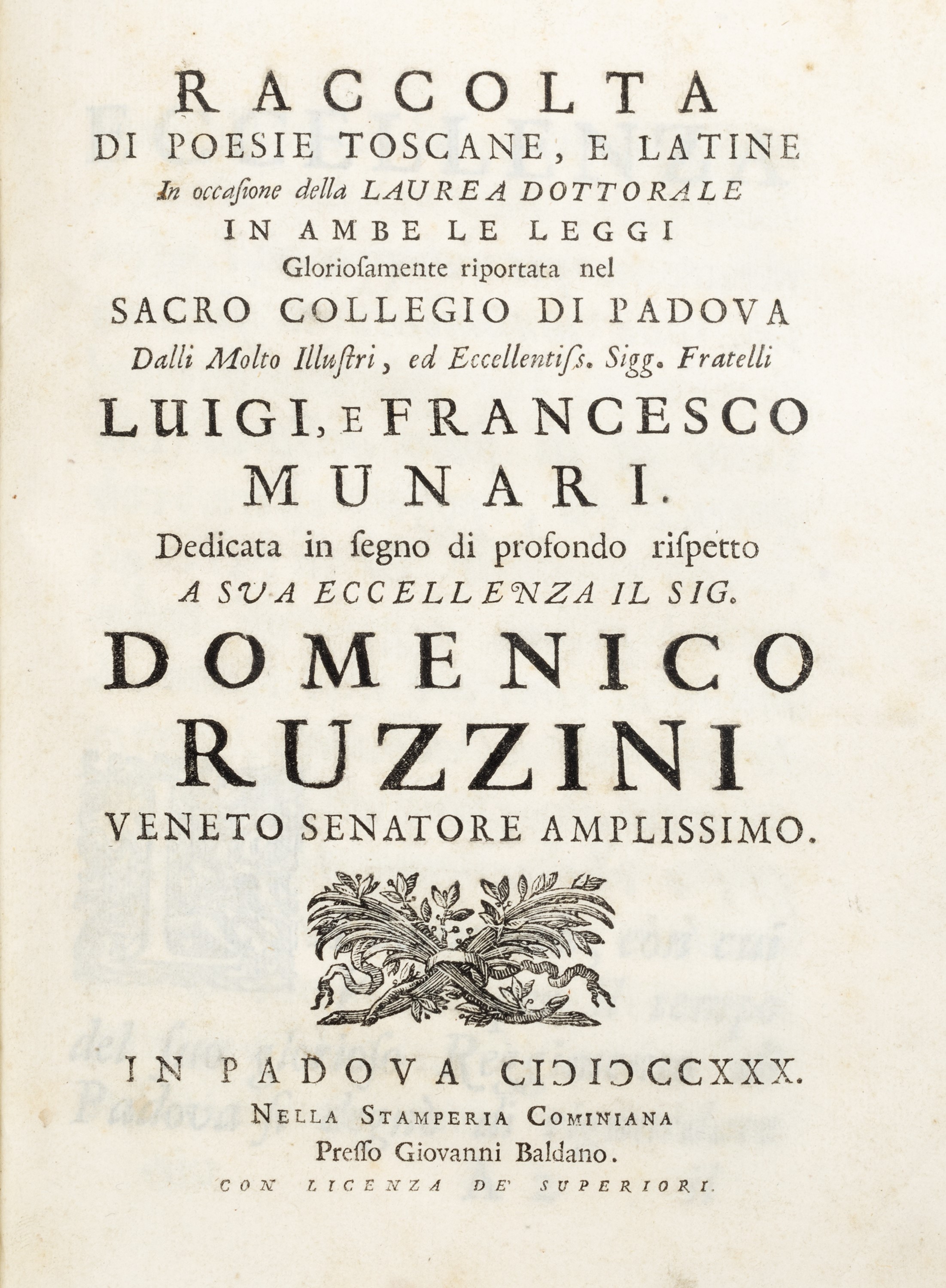 1730 Padova, stamperia cominiana, 1730. In 8° grande. Fregio tipografico al frontespizio, finalini ornati, legatura del sec, XVII in vitello rosso, ai piatti inquadrati da filetti in oro e una rotella stilizzata impressa a secco, dorso a 5 nervi,