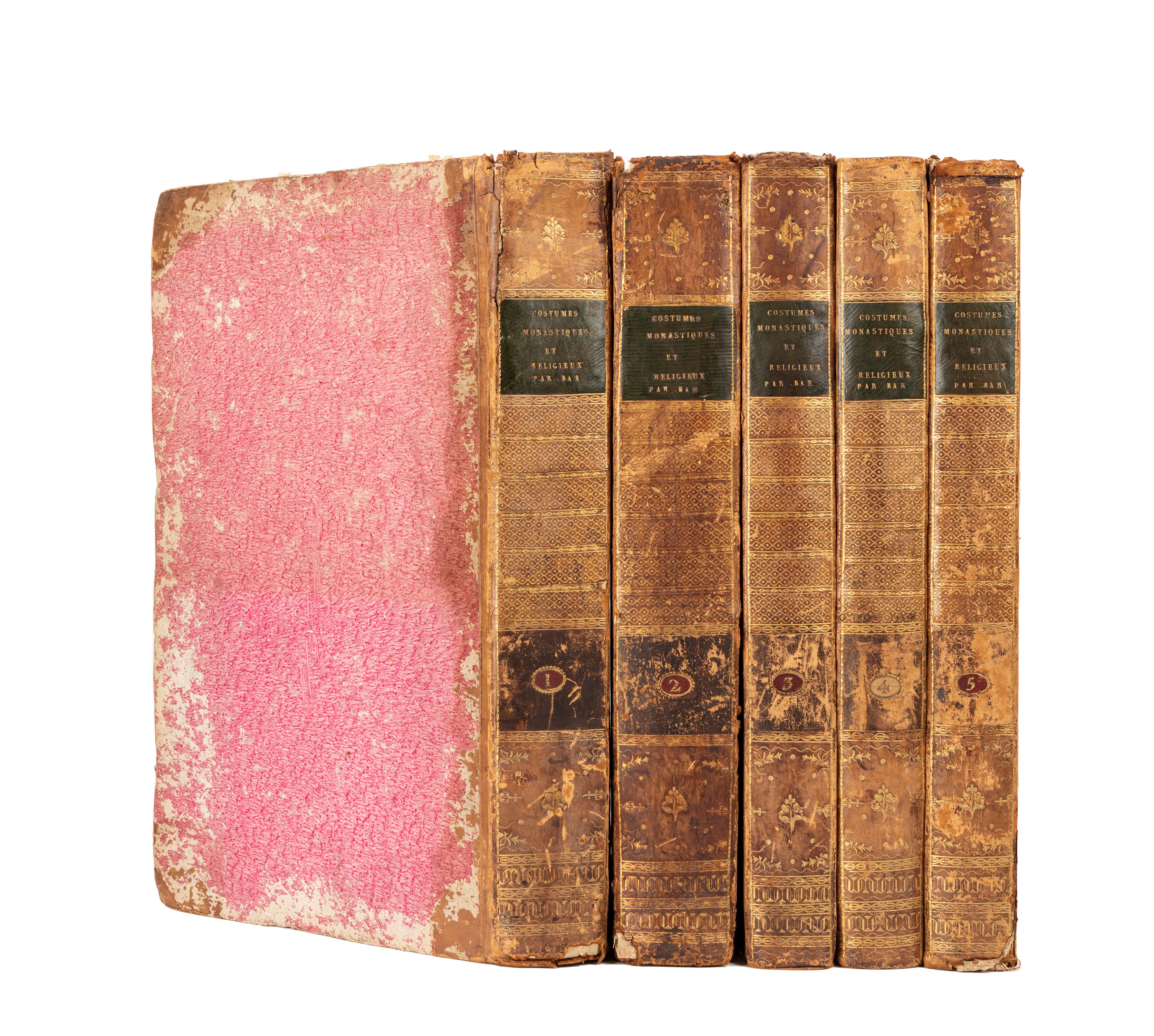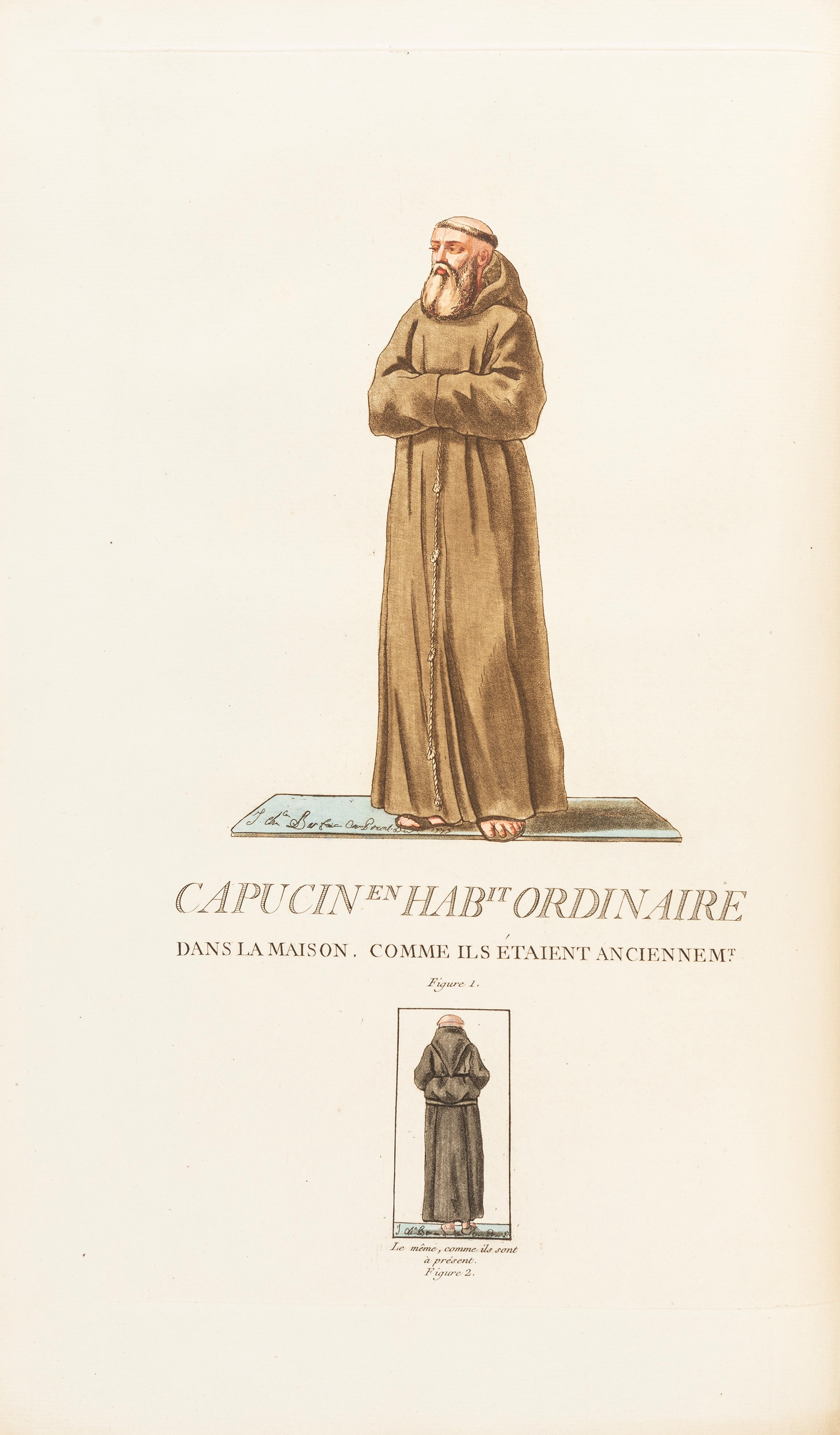 1778 Paris, chez l'auteur, 1778-1791. In 2°. 6 tomi in 5 volumi. Antiporte, titoli incisi con vignetta a colori, frontespizi incisi e colorati, oltre 500 tavole di costumi incise à la manière noire e colorate dallo stesso Bar, carte di testo in azzurro, ESEMPLARE IN BARBE, legatura in mezza pelle e cartonato rosa con titoli al dorso.