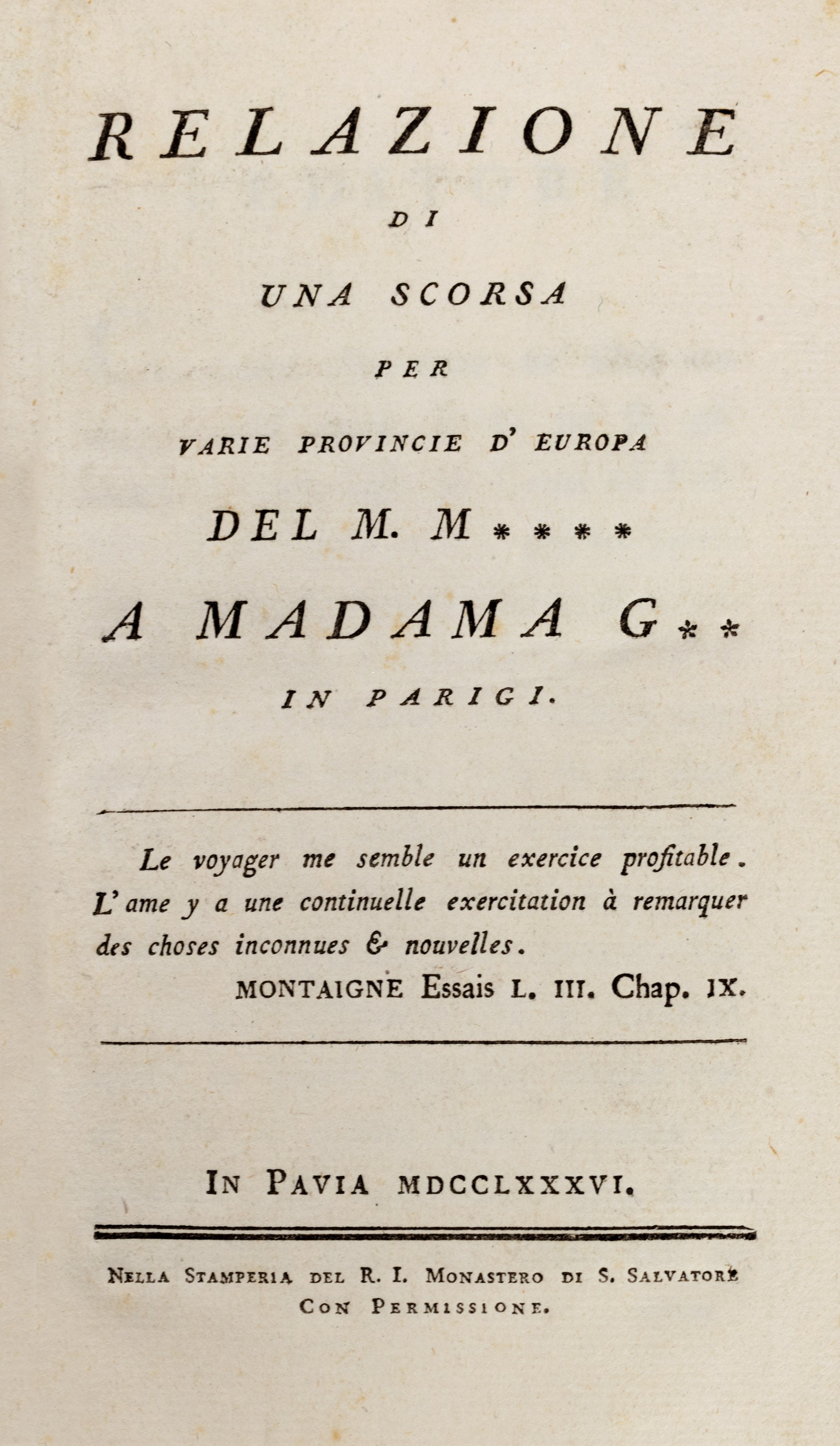 Pavia, Monasero di S. Salvatore, 1786. In 8°. Bell'esemplare in barbe, legatura coeva in mezza pergamena e carta marmorizzata. § M.me Amable Tastu, Voyage en France, Tours, Alfred Mame & fils, 1869. In 8°. Belle tavole finemente incise in rame e numerose illustrazioni nel testo, rarissime fioriture, legatura in chagrin, cornici impresse a secco ai piatti, autore e titolo impressi in oro al dorso.