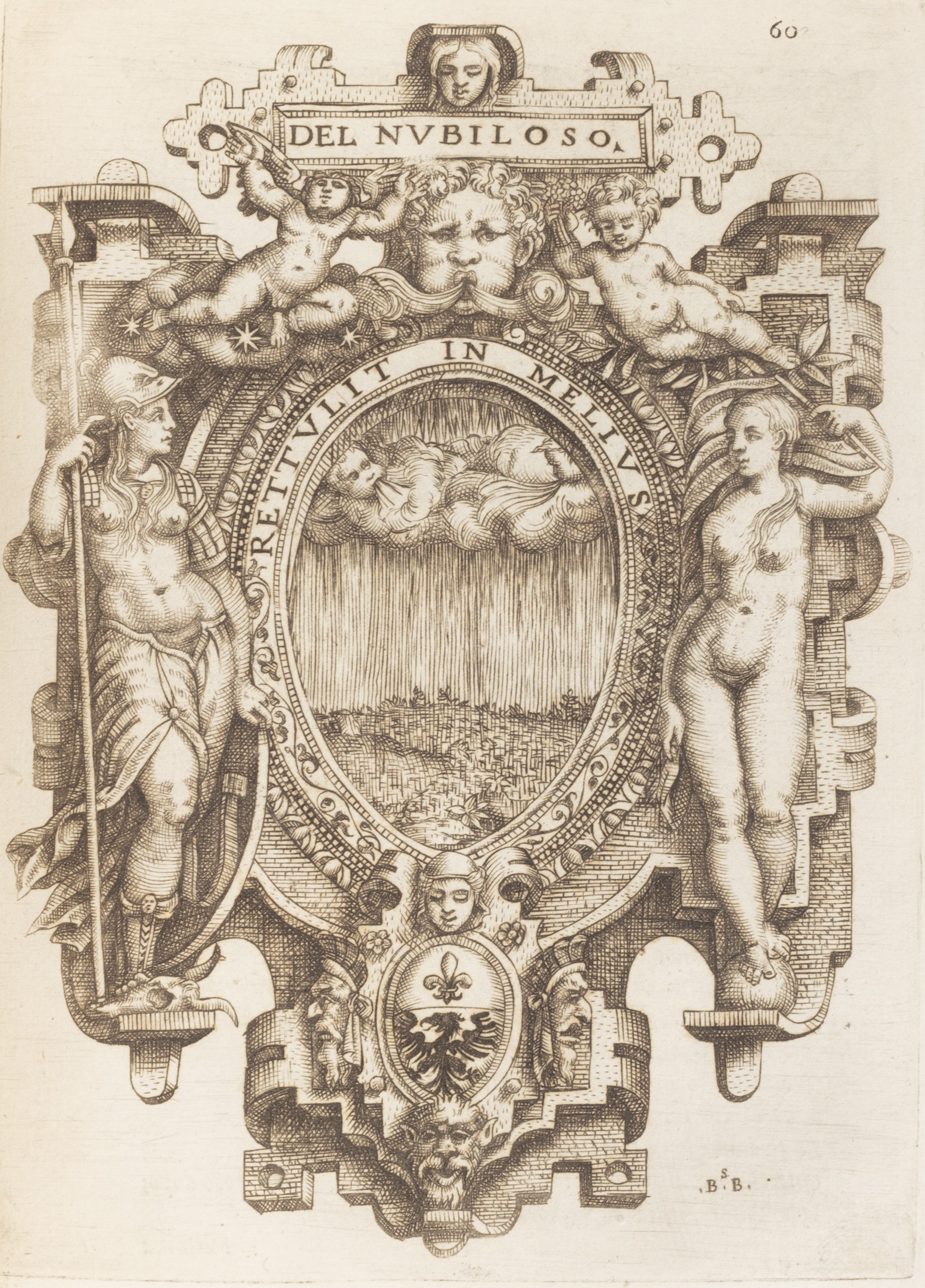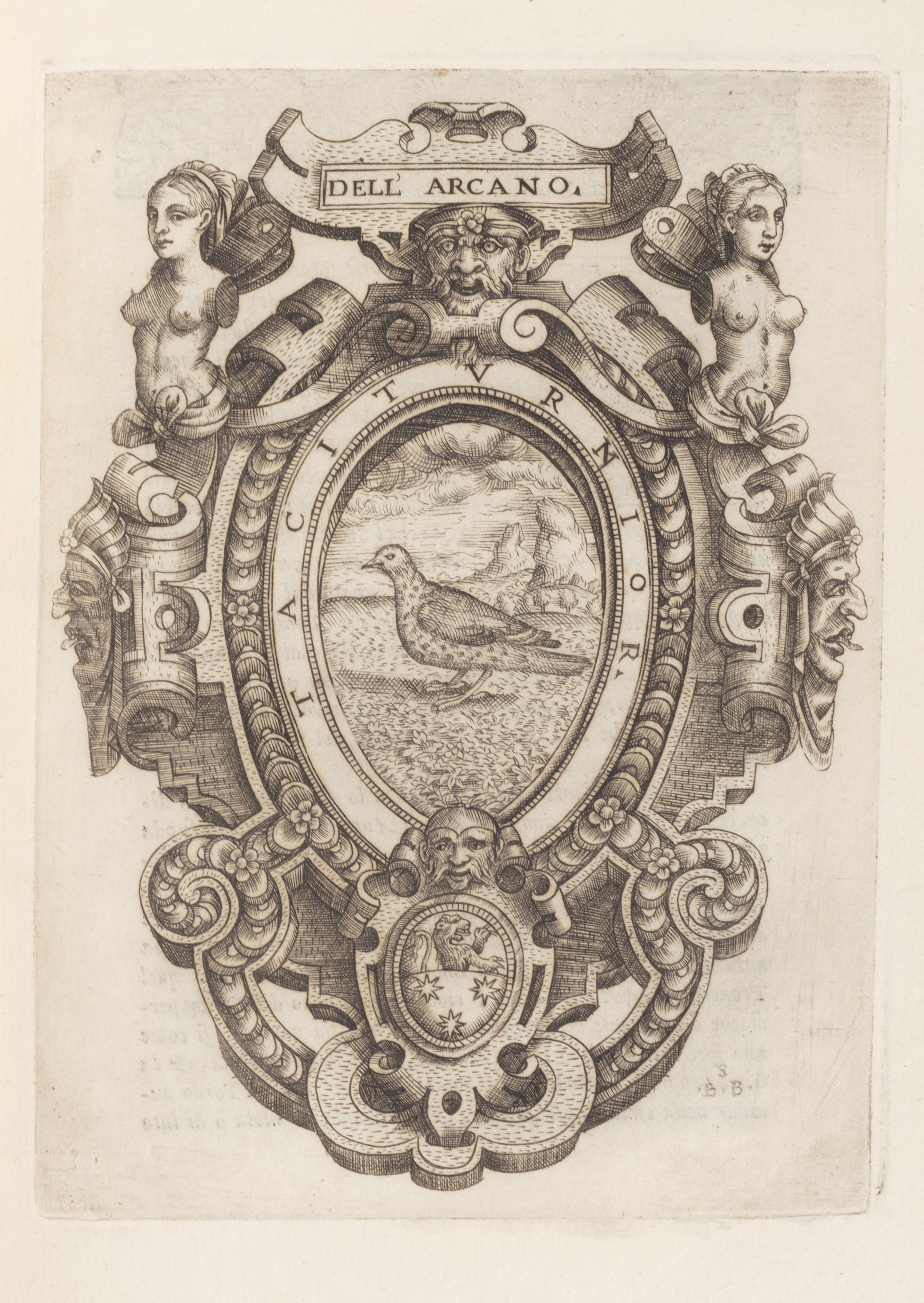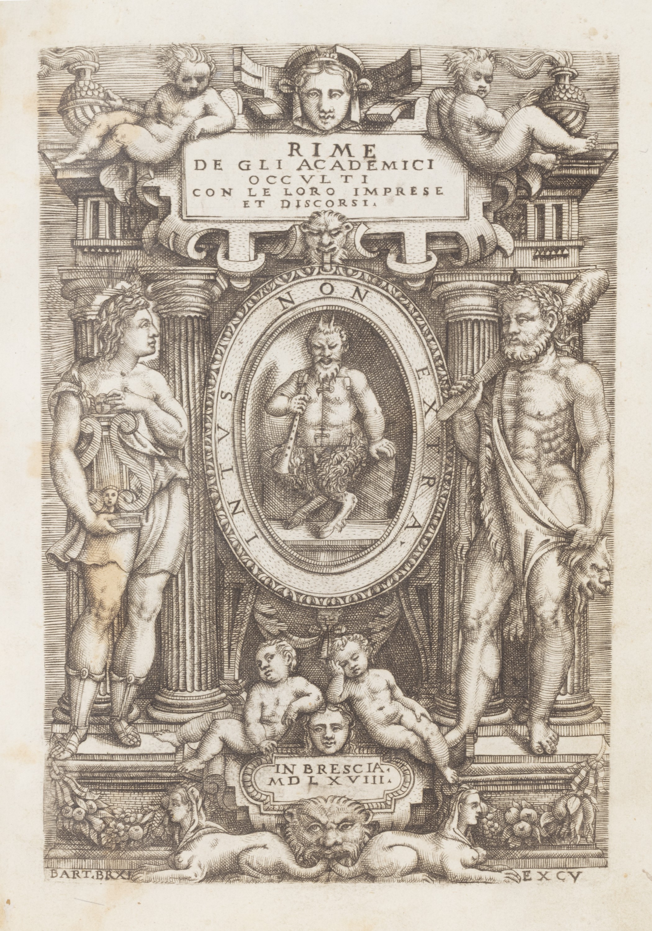 Brescia, Vincenzo Sabbio, 1568. In 4.°. Frontespizio allegorico d'impianto architettonico dove campeggia l'impresa dell'Accademia: il Sileno informato dal motto Intus Non Extra opera di Bartolomeo bresciano, dedicata alla signora Barbara Calina dal Segretario dell'Accademia, 15 imprese dei vari accademici incise in rame a piena pagina, lievi aloni, lievi macchioline, legatura in mezza pelle, del sec. XIX, al dorso liscio un tassello nero con titolo, fregi impressi in oro.
