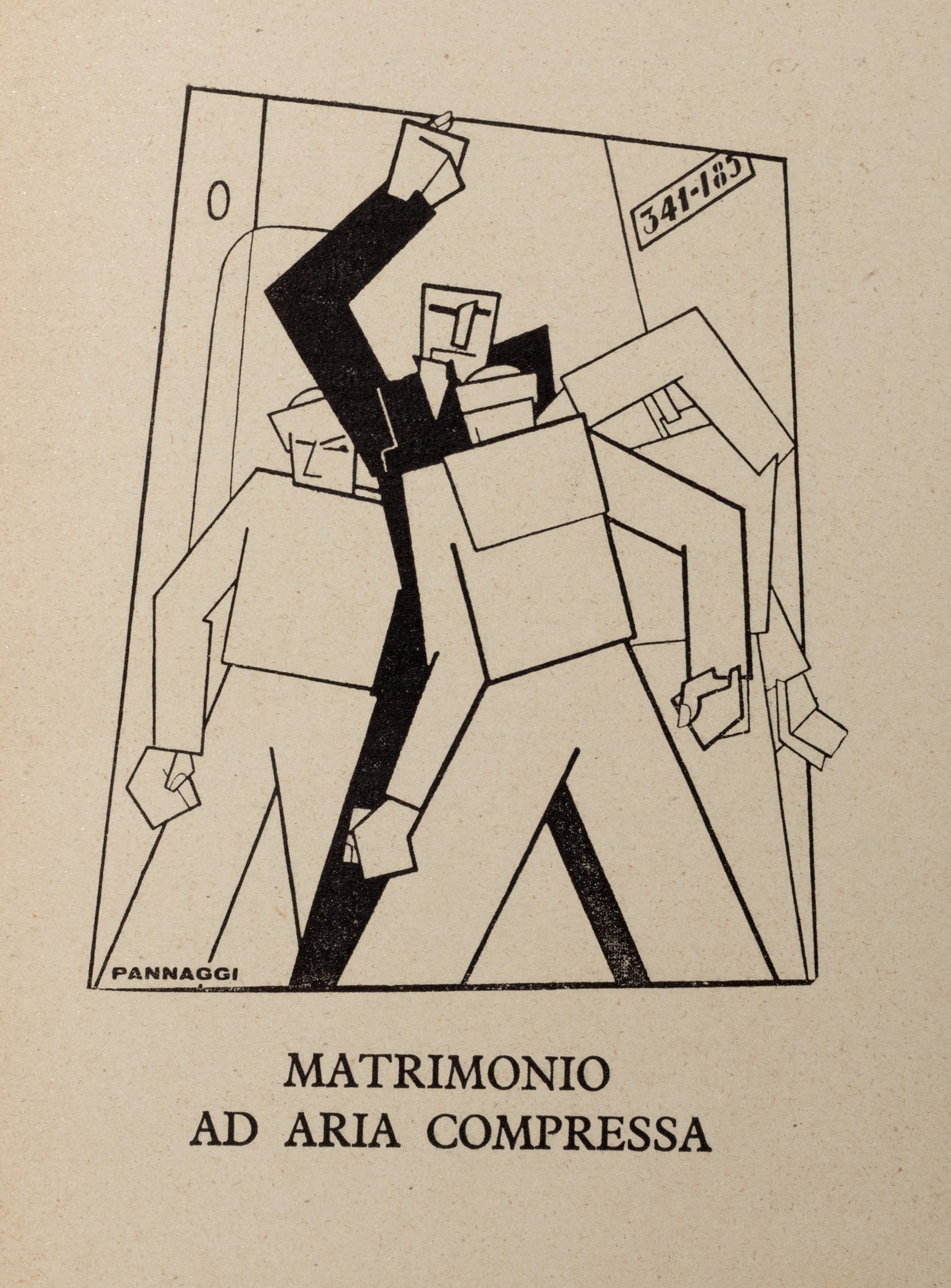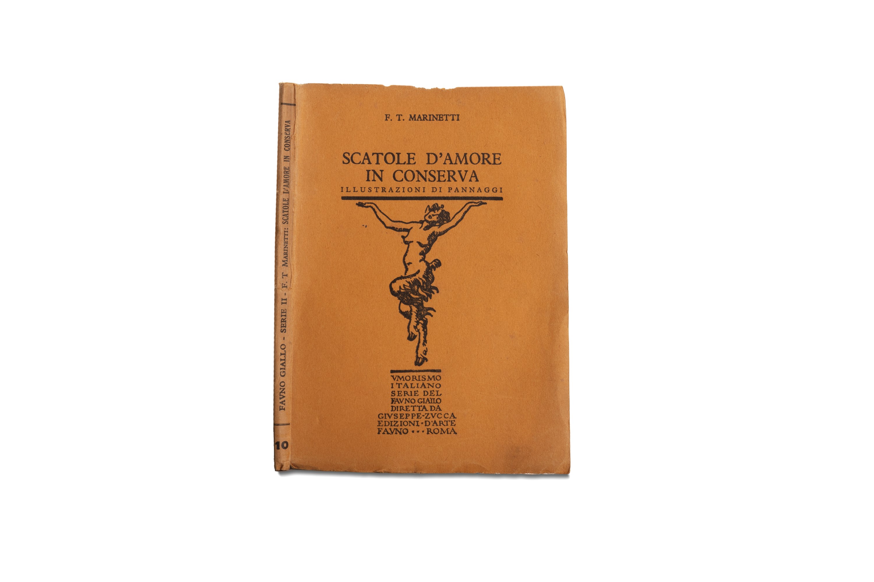 Roma, Edizioni d’arte Fauno, 1927. In 16°, pp. 92-(4) più 4 non numerate di pubblicità, illustrazioni di Pannaggi, tra cui un ritratto caricaturale di Marinetti, lievi difetti, brossura editoriale con coperta e fregi di Carlo A. Patrucci, lievi difetti.