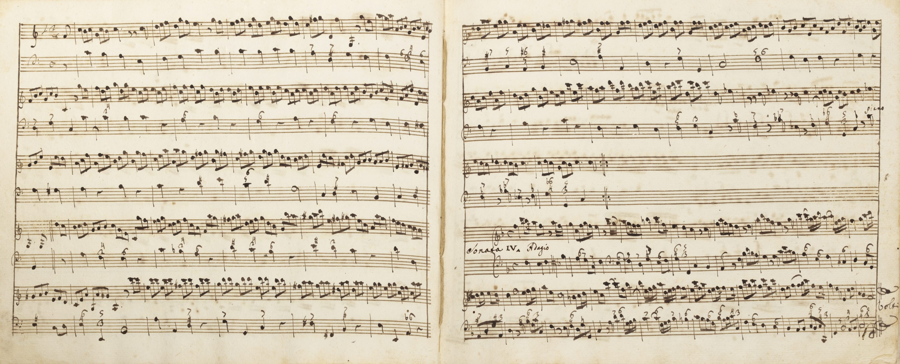 1700 Spartito cartaceo in 4° oblungo, 220 x 280 mm., 32 cc. con bel frontespizio inciso a volute che reca il titolo manoscritto all'interno, suddiviso in due parti, piccolo strappo all'angolo inferiore della prima carta, legatura in pergamena rigida, sciupata.