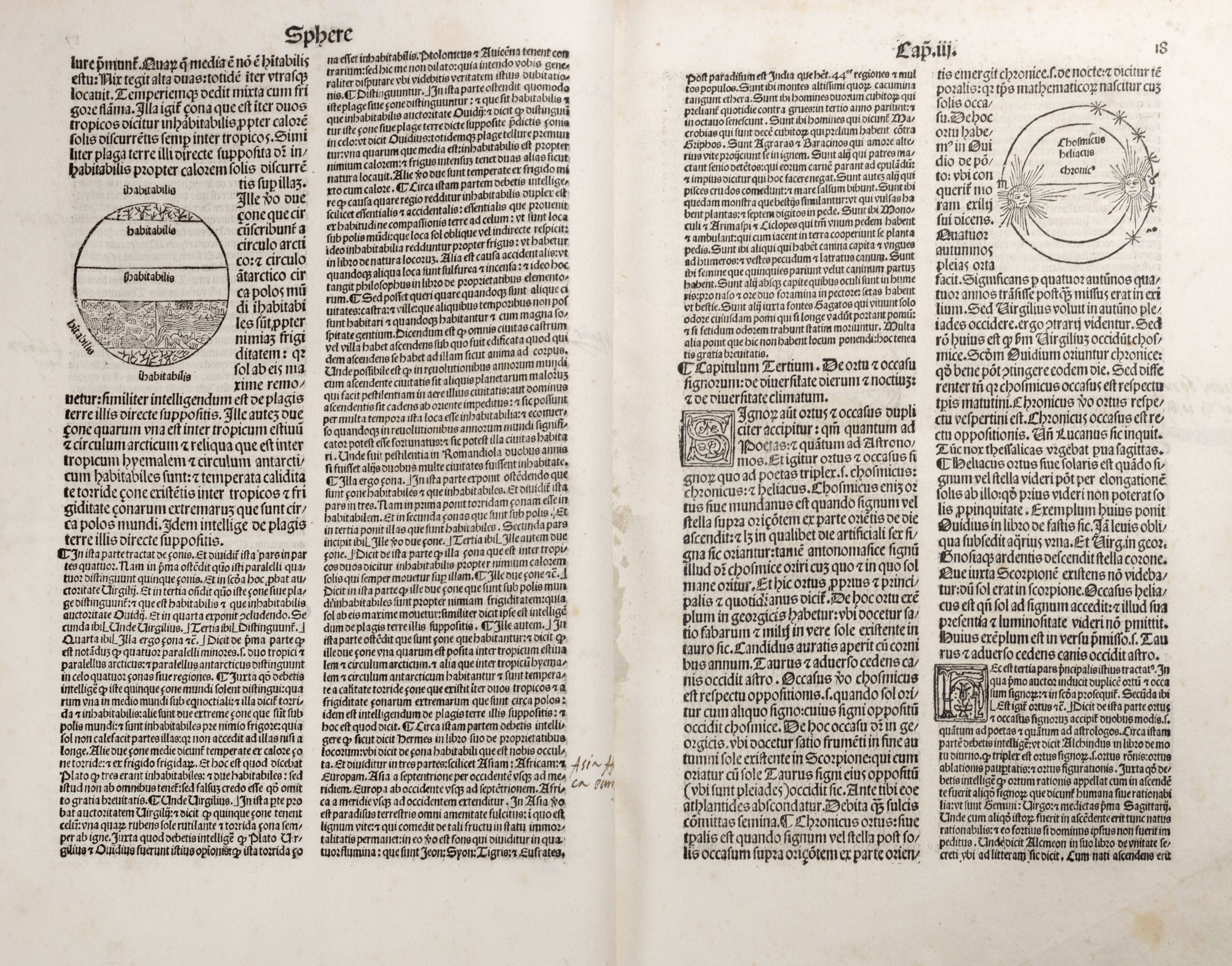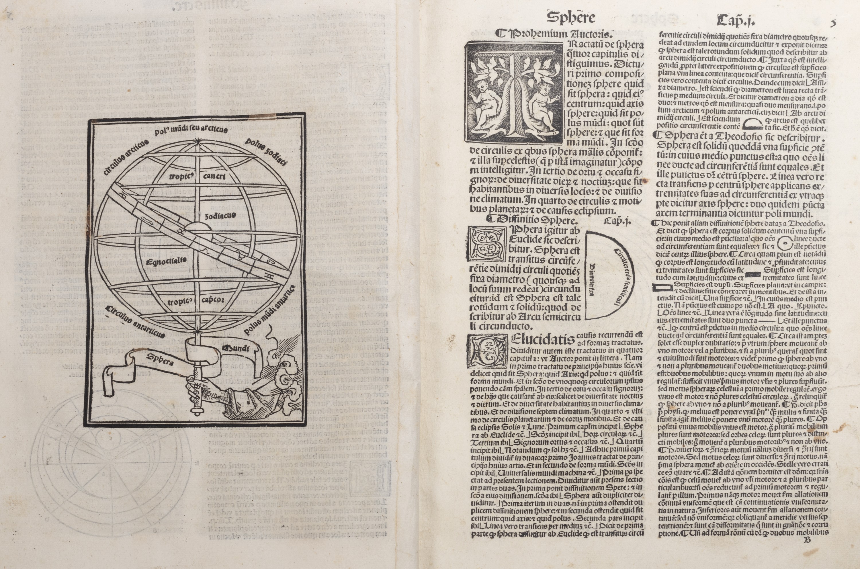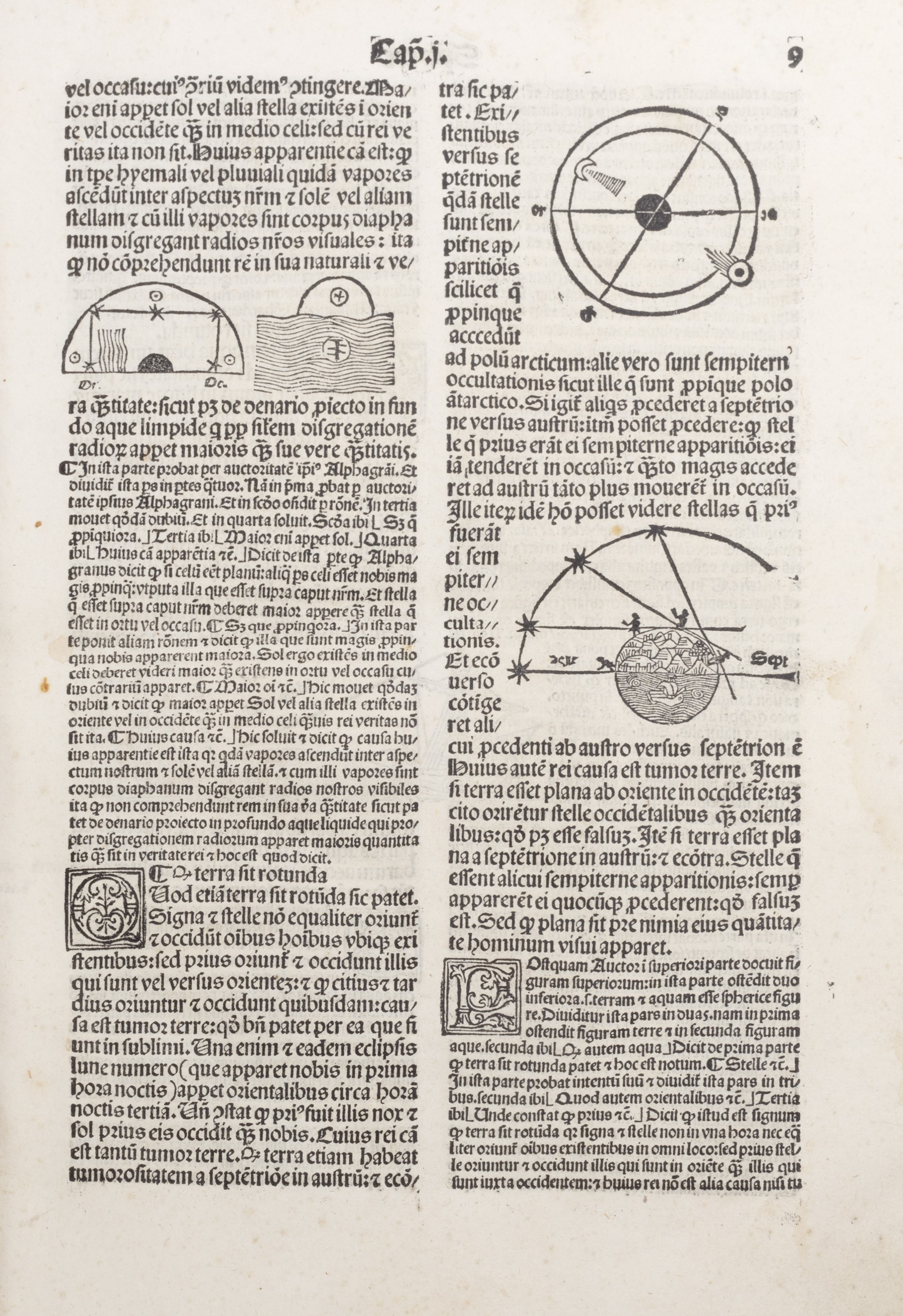 Venezia, Lucantonio Giunti, 1518. In 2°. Grande astrolabio a carta 5v, testo illustrato da moltissime figure e schemi astronomici in xilografia, capilettera incisi, testo in carattere gotico su due colonne, note a margine di antica mano, frontespizio mutilo, qualche alone, errori di numerazione delle carte, errori nella disposizione delle ultime carte in fase di rilegatura, legatura del sec. XIX in mezza pergamena con angoli, titoli stampati si tasselli rossi al dorso. Nota di possesso mutila al frontespizio.