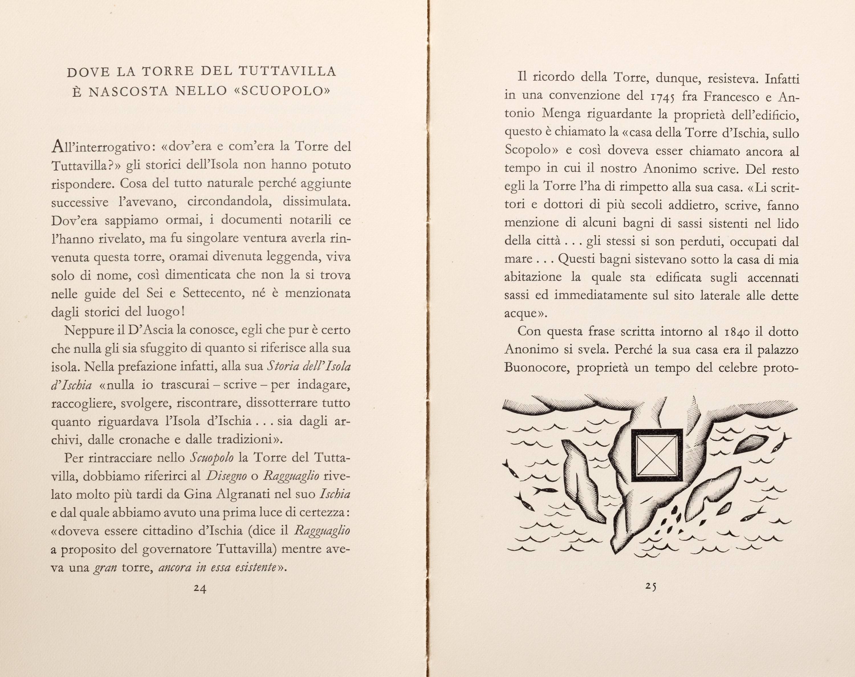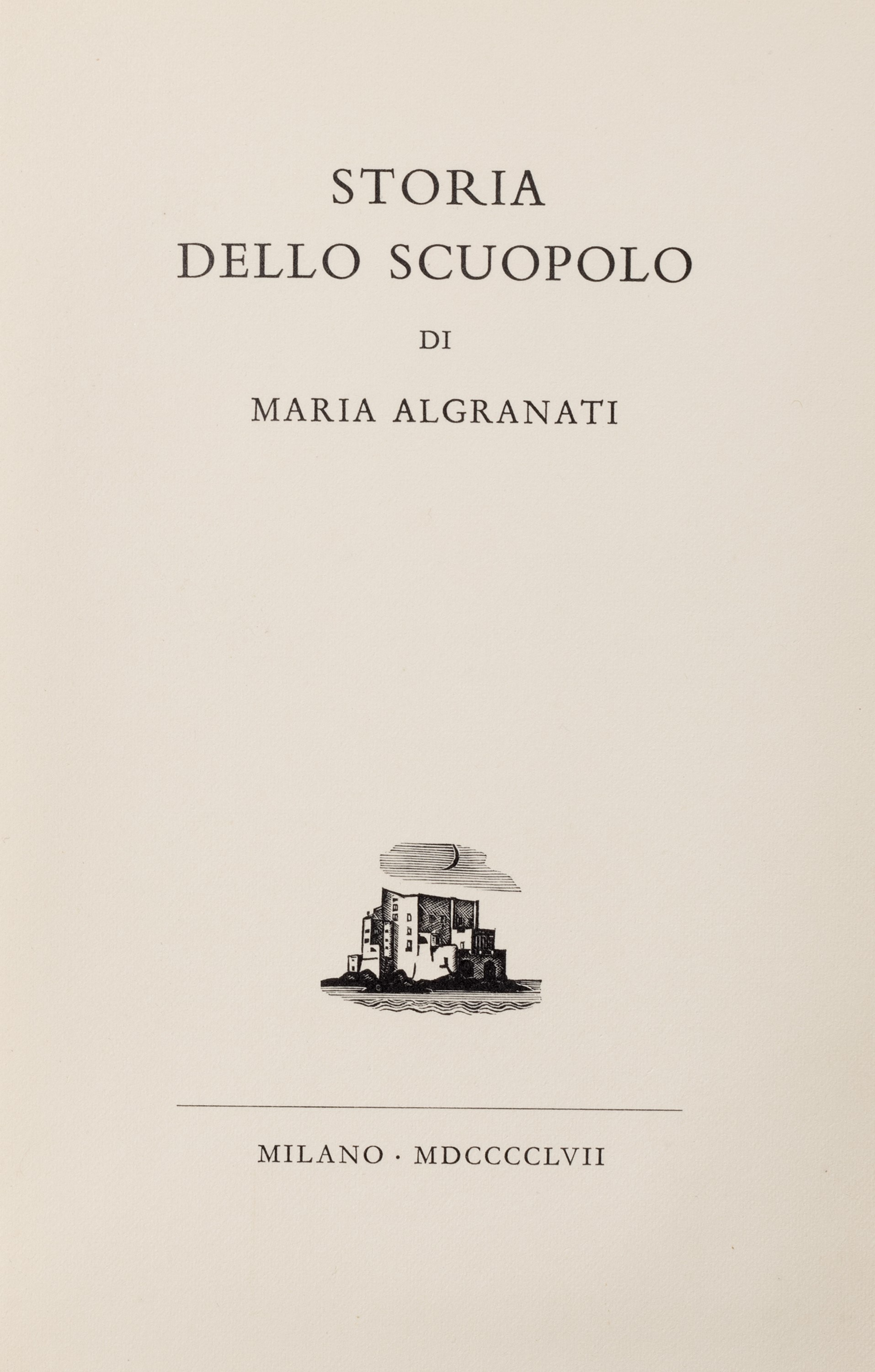 Milano, 1957. Al colophon: Impresso a Verona, con xilografie di Italo Zetti, nella Stamperia Valdonega di Giovanni Mardersteig per gli amici di Vera e Piero Malcovati. In 8°, pp. 32-(4) con 12 xilografie n.t. di Italo Zetti; in allegato Testo e facsimile del documento di compra vendita dello Scuopolo, Napoli 5 marzo 1789”. Firma autografa dell'autrice all'occhietto, lievi difetti, legatura in cartonato editoriale con fregio in oro al piatto e tit. in oro al dorso, taglio superiore dorato.