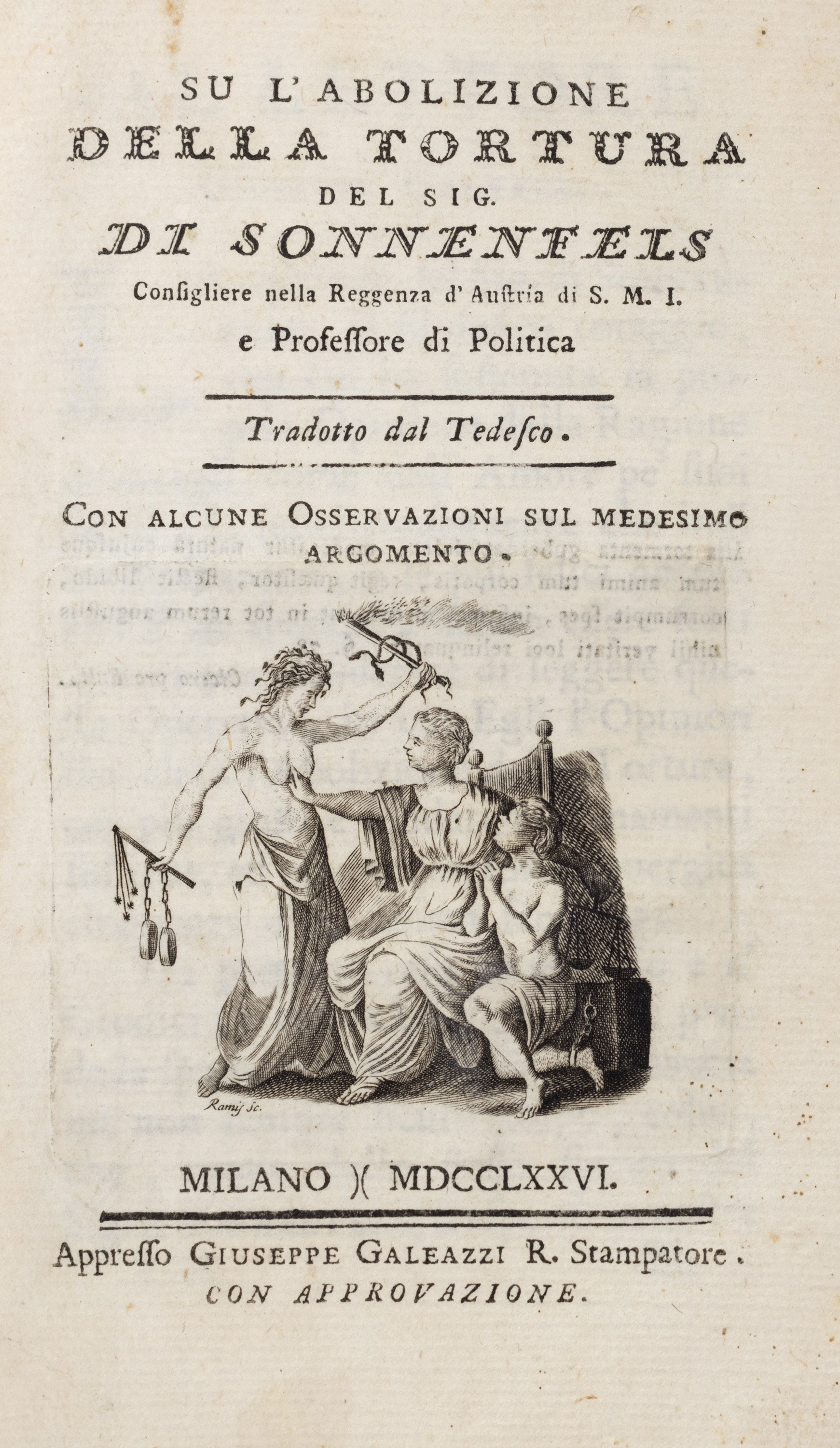 1776 Milano, Giuseppe Galeazzi, 1776. In 8°. Esemplare in barbe con bella vignetta incisa in rame al frontespizio che raffigura l’allegoria della giustizia, fregi xilografici, rare e lievi fioriture marginali, legatura di epoca successiva in tela marrone, autore e titolo impressi in oro entro tassello al dorso, piccolo graffio al piatto anteriore.