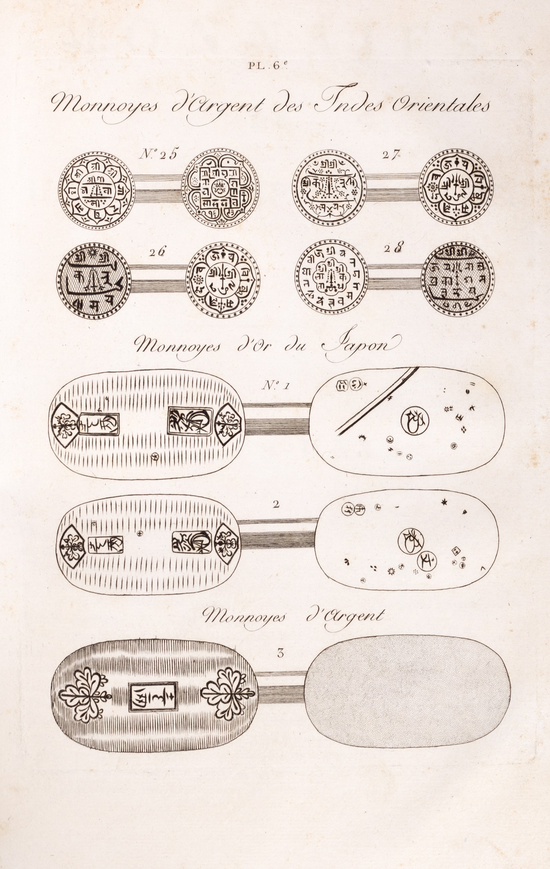 Parigi, Bonneville e Duminil-Lesueur, 1806. In 2°. Occhietto con firma dell'autore al verso, con 188 tavole incise in rame, leggera brunitura, lievi fioriture, legatura coeva in mezza pergamena, autore e titolo impressi in nero al dorso, piatto anteriore e dorso staccati dal corpo del libro, lievi difetti. Tassello cartaceo bibliotecario al contropiatto. § Magnan, Dominique, Bruttia numismatica seu, Bruttiae, hodie Calabriae, populorum numismata omnia. Roma, Arcangelo Casaletti e Giuseppe Monaldini, 1773. In 2°. Frontespizio inquadrato da elegante cornice, con numerose tavole incise in rame, lievi fioriture, primi fascicoli con leggera brunitura, carte di guardia in carta marmorizzata, legatura coeva in vitello, tagli blu, titolo impresso in oro entro dorso con fregi a 6 nervi, qualche spellatura, lievi difetti. Tassello cartaceo bibliotecario al contropiatto.
