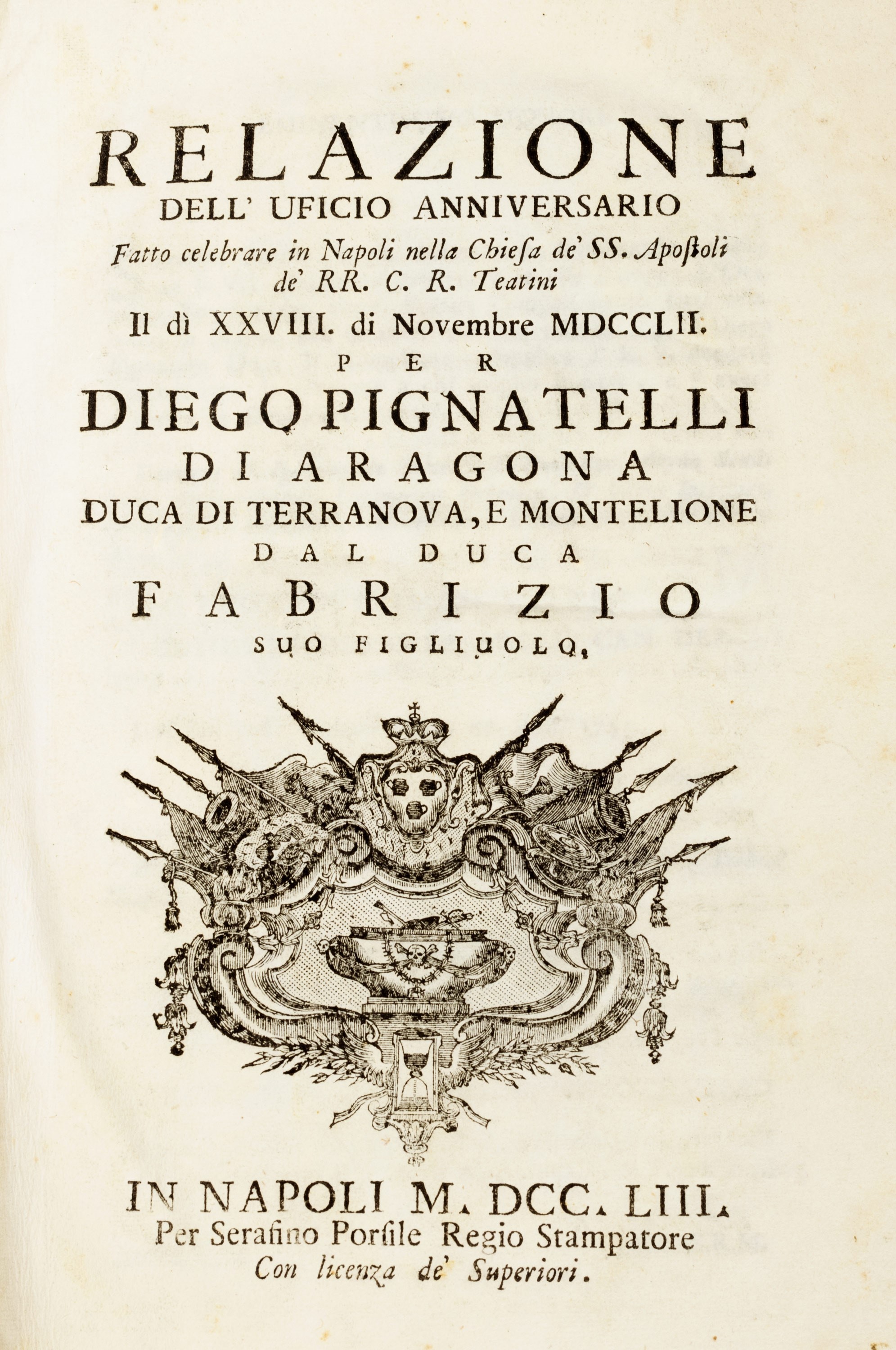 1704 Napoli, Michele Luigi Mutio, 1704. In 4°. Antiporta incisa, monogramma dei Gesuiti sul frontespizio, iniziali e fregi xilografici, leggera brunitura, su alcune carte più intensa, lievi fioriture, rari e leggeri aloni, piccole lacune al margine bianco esterno delle prime carte, legatura coeva in pergamena, difetti. § Relazione dell'uficio anniversario fatto celebrare in Napoli nella Chiesa de' SS. Apostoli [...] per Diego Pignatelli di Aragona, Napoli, Serafino Porsile Regio Stampatore, 1753. In 4°. Fregio xilografico al frontespizio, testatine, fregi e capilettera xilografici, mancanti l'antiporta e le tavole, ultima carta bianca mancante, occhietto parzialmente staccato, lieve alone all'angolo superiore esterno, rare piccole macchie, contiene l'Orazione di Nicola Caracciolo C.R. teatino detta fra le solennità dell'uficio anniversario a lode di Diego Pignatelli, legatura coeva in pergamena, lacune al dorso, difetti.