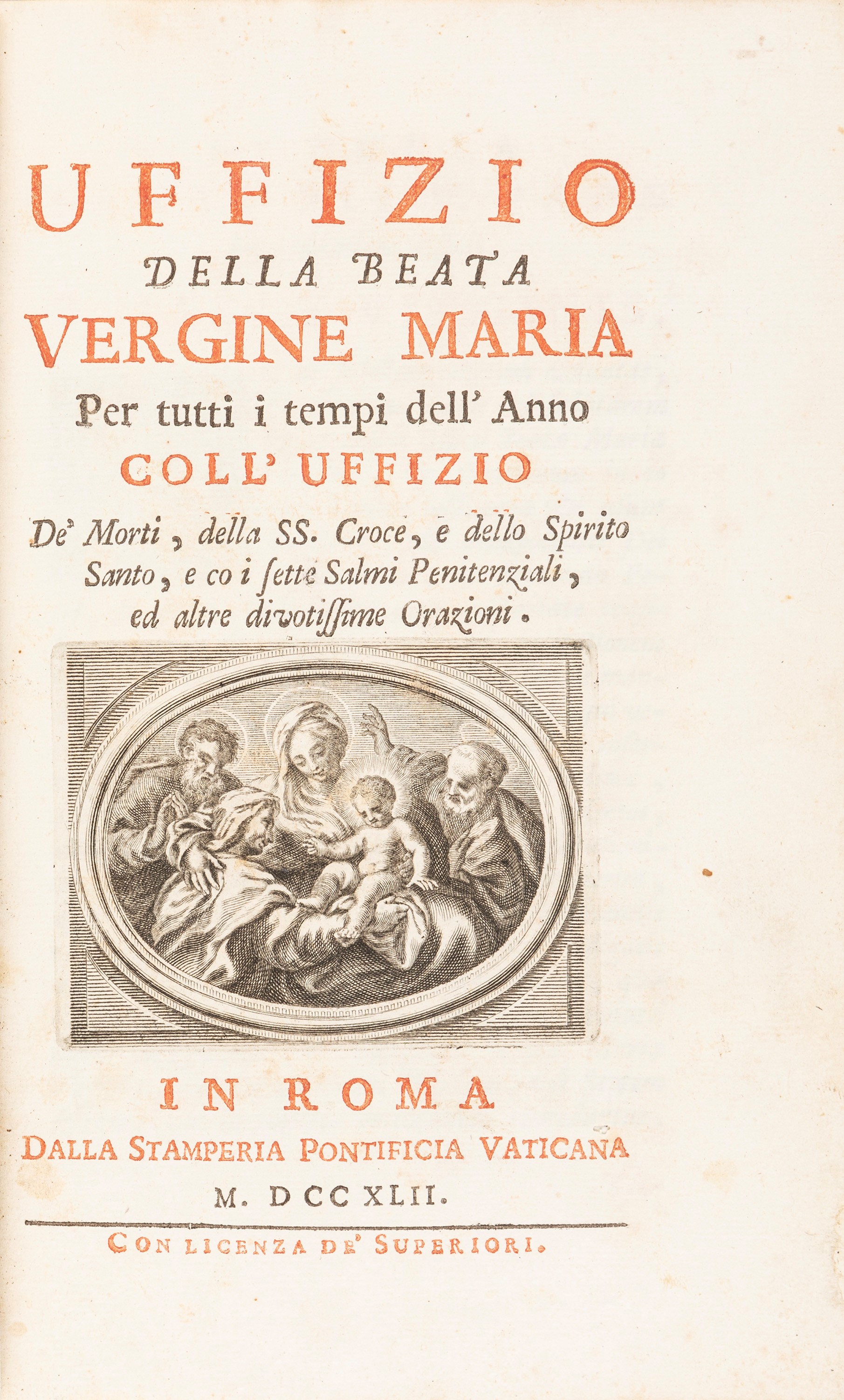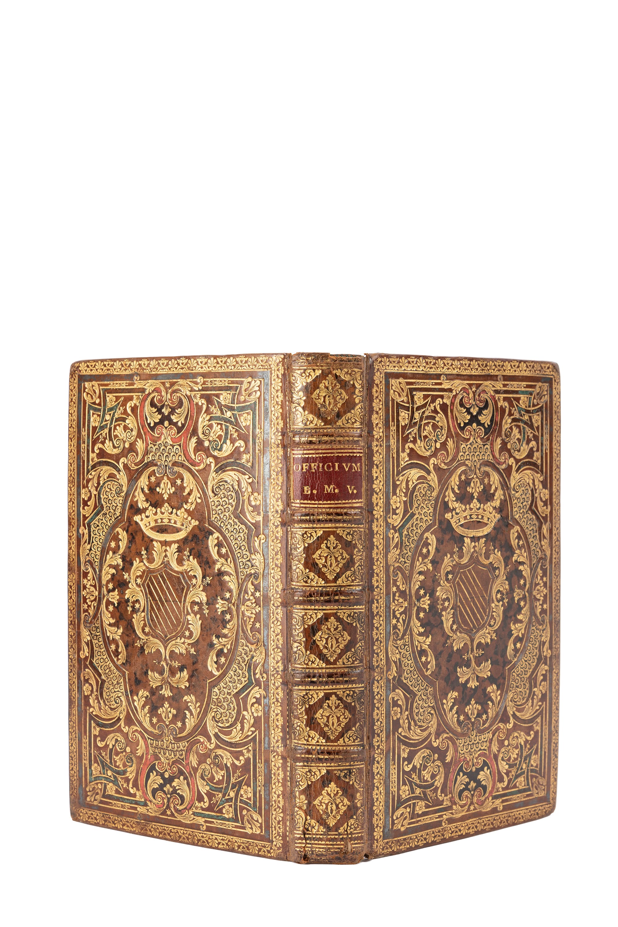 1742 Roma, dalla Stamperia Pontificia Vaticana, 1742 (presso Giovanni Maria Salvioni stampator, 1742). In 8°. 214 x 140 mm. Frontespizio con incisione in rame raffigurante la Sacra Famiglia, antiporta su rame da disegni di Giuseppe Passari (1654-1714) e incisa da Arnold van Westerhout (1651-1725), altre 13 tavole sempre incise su rame da disegni del Passari, lievi fioriture. SPETTACOLARE LEGATURA MOSAICATA BAROCCA ROMANA in pelle nocciola, dorso a cinque nervi con fregi in oro e titolo su tassello rosso, i piatti racchiusi da una cornice filettata in oro al cui interno giacciono volute di nastri intrecciati, i cui campi sono riempiti da un reticolato cosparso di fiori, alle varie estremità decori a motivi geometrici e fogliame, al centro dei piatti vi è uno stemma nobiliare sormontato da una corona ducale, tagli dorati con decorazioni dipinte in rosso e verde a motivi floreali, lievi spellature alle cuffie.