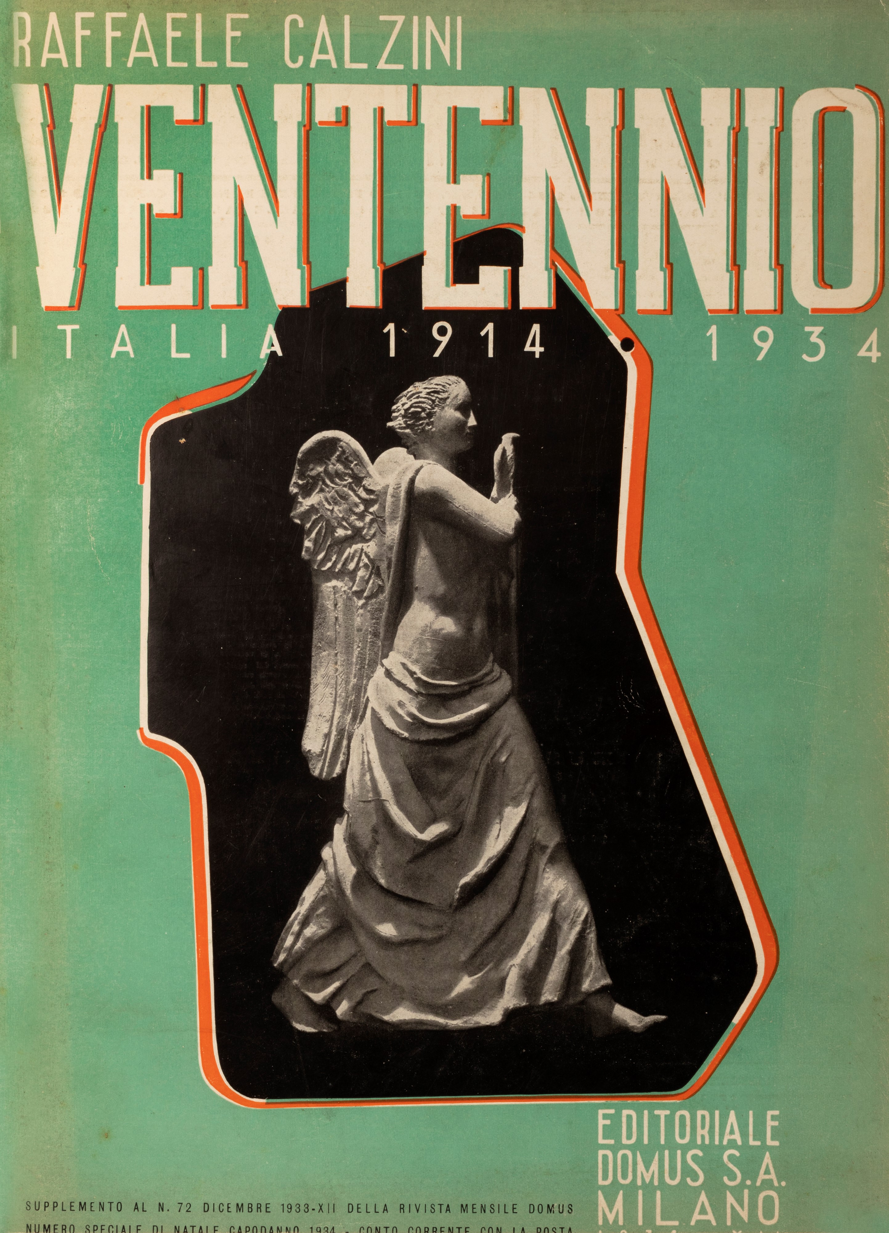 Milano, Editoriale Domus, 1933. In 4°, pp. 178 con oltre 200 illustrazioni in nero e a colori, alcune ripiegate raffiguranti pagine pubblicitarie e opere d'arte (pittura, scultura, architettura scenografie) del periodo di artisti futuristi e delle avanguardie: Sironi, Prampolini, De Chirico, Soffici, Carrà, Casorati, Dazzi, Piacentini. Legatura coeva mz. tela con angoli, tassello, titolo in oro al dorso, copertine originali conservate.
