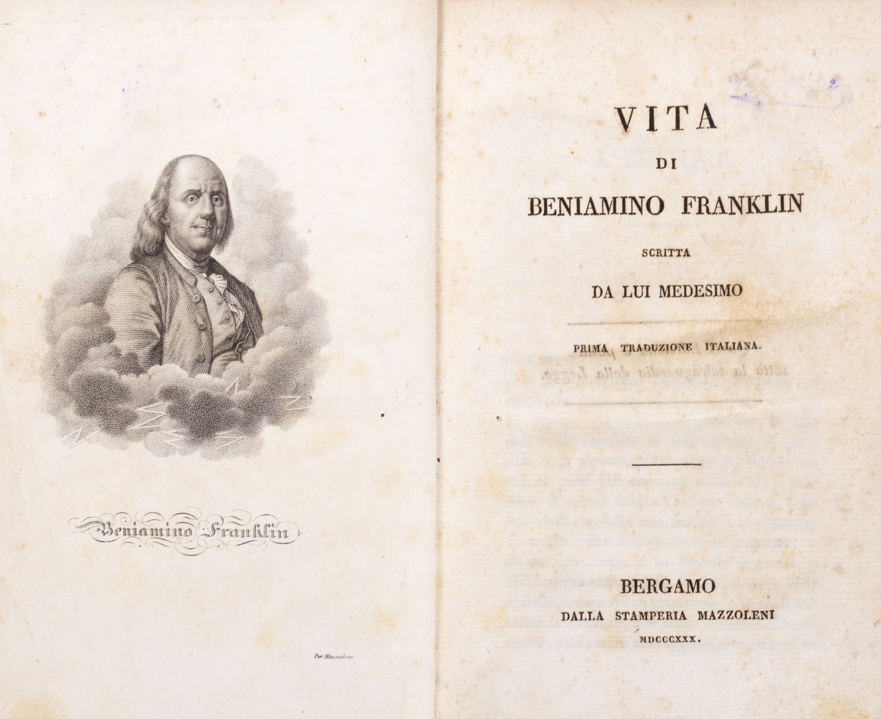 8°. Ritratto di Franklin inciso su rame in antiporta, iniziali, testatine e finalini incise, lievi difetti, legatura coeva in mezza pelle, cordoni, titolo e fregi in oro al dorso, tagli colorati.