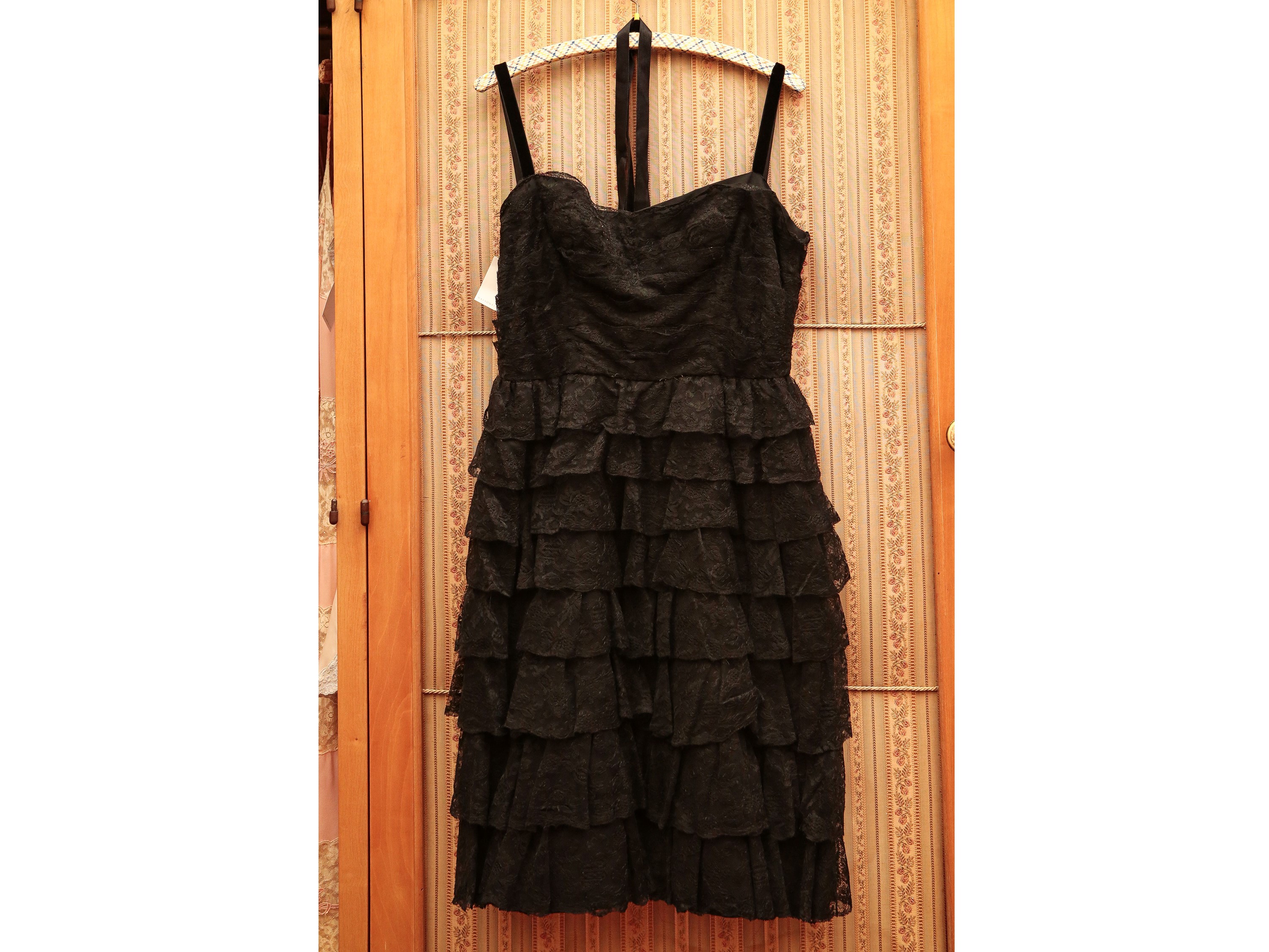 Anni Cinquanta in pizzo nero, scollo a cuore e gonna a balze, lievi difetti