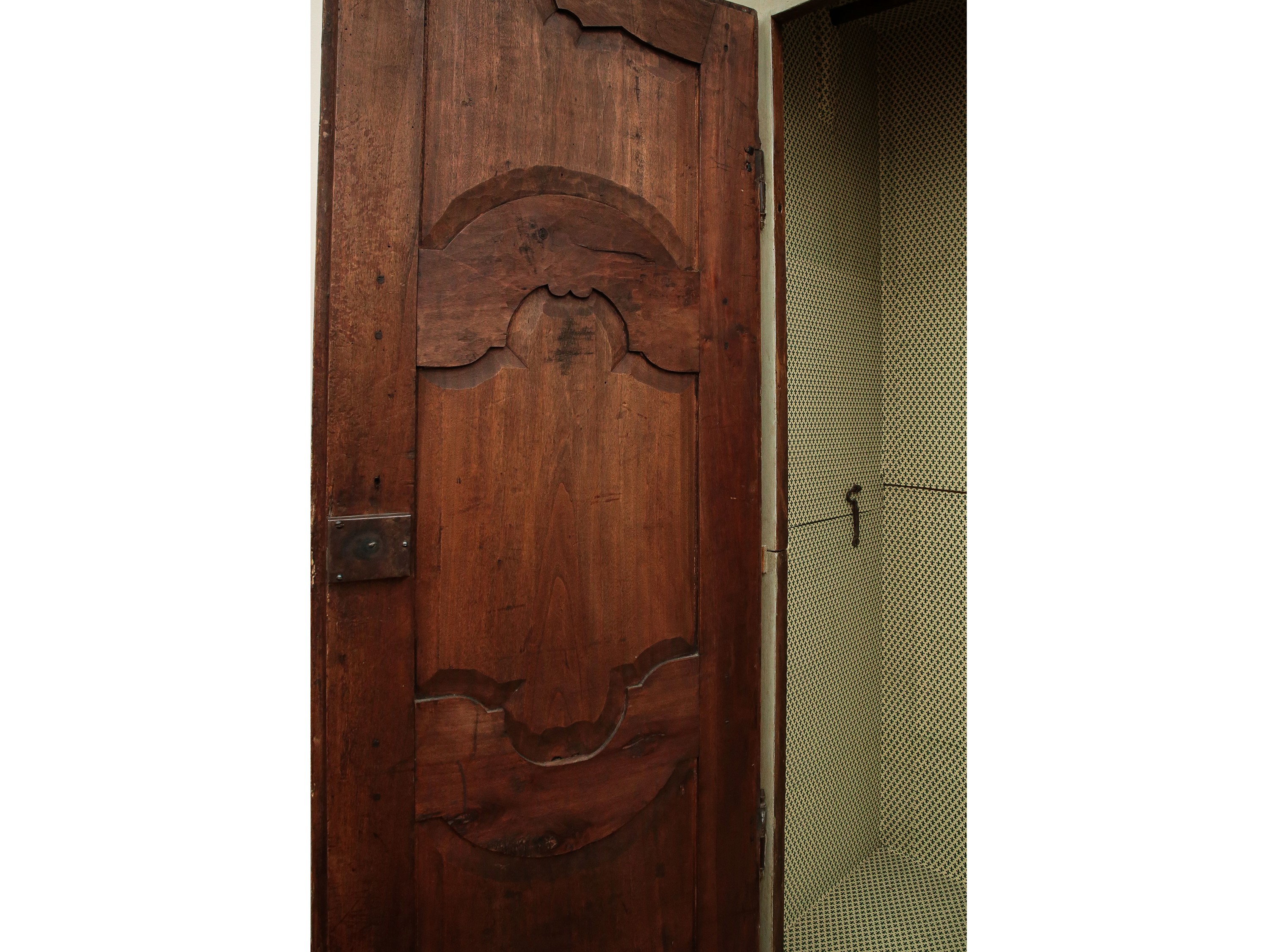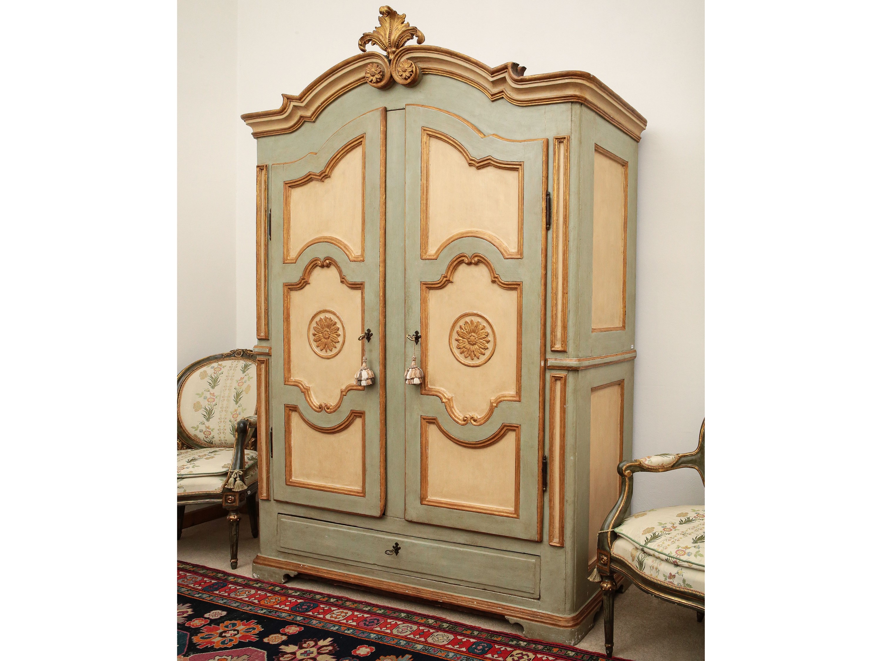 h cm 233x150x56 Italia centrale, metà del XVIII secolo dipinto nei toni dell'avorio e del verde acqua e lumeggiato in oro, cimasa mossa con volute contrapposte centrate da trionfo di foglie d'acanto, due sportelli con cornici piatte sagomate centrate da rosone, un cassetto nella base, piedi a mensola, lievi difetti e restauri