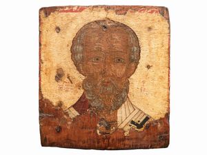 cm 22,5x21,5 Russia, XIX secolo olio su tavola raffigurante volto di Santo, difetti