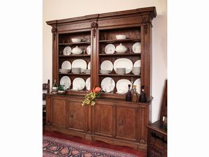 h cm 257x240x52 XX secolo realizzata in stile seicentesco, cappello aggettante, due sezioni con scaffali a giorno [..]