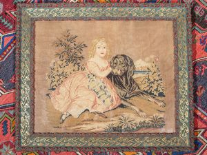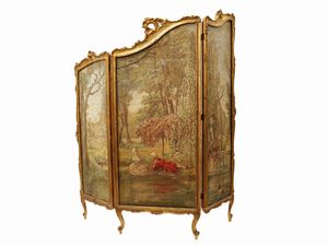 cm 143x126 inizio del XX secolo le tre ante dipinte ad olio su tela con scena galante di gusto settecentesco [..]