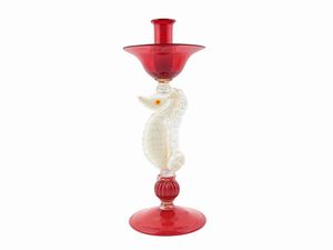 H cm. 34 Murano, seconda metà del XX secolo. stelo costituito da ippocampo in vetro trasparente con inclusioni [..]