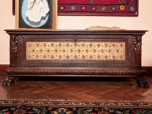 h cm 112x153x62 XVII secolo interamente intagliato ad altorilievo con figure antropomorfe, piano con motivo sottostante [..]