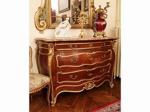 h cm 91x122x58 inizio del XX secolo di gusto francese, piano in marmo rosso, tre cassetti sul fronte leggermente [..]