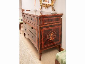 h cm 84x121x54 fiine del XVIII/inizio del XIX secolo intarsiato con motivo di figura neoclassica entro cornice [..]