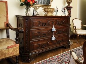 h cm 99x151x61 XVII secolo tre cassetti con formelle sagomate in rilievo sul fronte tra lesene scantonate intagliate [..]