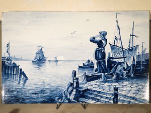 cm 36x56 inizio del XX secolo dipinta in monocromia blu con paesaggio marino di gusto olandese, al verso reca [..]