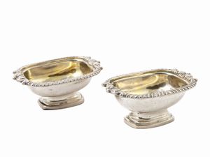 gr 580, h cm 26x32x15 Londra, 1795 di gusto neoclassico, due ampolle ovoidali e due salsiere a coppa in cristallo [..]