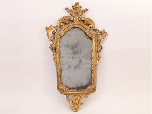cm 73x40 XVIII secolo cornice trapezoidale con cimasa intagliata a volute contrapposte e centrata da conchigl [..]