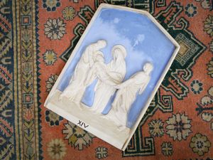 cm 47x32 XX secolo composta da quattordici formelle ad alto rilievo in terracotta smaltata in stile robbiano, [..]