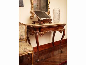 h cm 92x36x28 XX secolo schienali sagomati centrati da cartiglio intagliato con motivo di giglio e stemma nobiliare, [..]