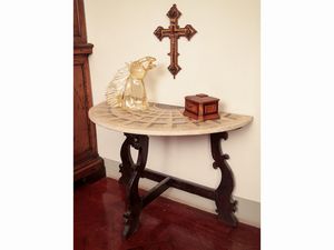h cm 77x114x56 piano in legno laccato e dipinto ad imitazione di motivo architettonico nei toni del grigio e dell'ocra, [..]